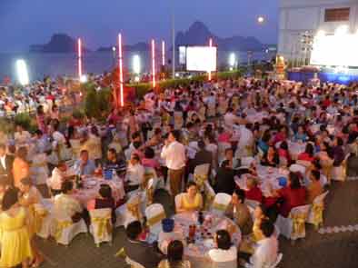 16日(日)の夕方より、ハットトーンホテルの駐車場とその前の海沿いの道路を封鎖して、義弟の披露宴が行なわれました。出席者は約1000名。みんな気合を入れて着飾ってきています。料理はメークローンから出張を頼んだ中華のコースでした。爽やかな海風に、料理がよけいに美味しく感じられました。新郎新婦は、会場入り口で出席者を迎え、全員といちいち記念写真を撮ります。親族や友人とならともかく、まったく知らない人とでも満面の笑顔で写真に収まります。私の時もやりましたが、これが数時間ずっと続くのでしまいには足が棒のようになります。そのくせ、式が終わった後、それらの写真はただの一度も見たことがありません。(笑)出席者は、席に着くとそれぞれ自由に食事を始めます。日本のように、面白くもないスピーチを延々と聞かされている間、すきっ腹を抱えてお預けを食わされることもなく、その点は楽です。引き出物は(写真は撮り忘れましたが)小さな記念品程度で、欲しくもない物を山のように手渡されることもある日本の結婚式より合理的かもしれません。披露宴のハイライトは、やはり新郎新婦が育ててくれた両親に感謝の言葉を述べるシーン。新郎も新婦も声を詰まらせながら、万感こめて両親にお礼を述べます。義母も、頑固でおっかない義父までも涙ぐんでいて、私も思わず目頭が熱くなりました。二人ともゼロというよりマイナス状態からスタートして、事業を起こし大変な苦労をしながら子供5人を育てあげてきた人達だから、胸に迫る思いも強かった事と思います。式は滞りなく進んで、夜9時前に終わりました。和やかないい式でした。娘の望が結婚する時も、きちんとした式を挙げてあげようと秘かに胸に誓いました。私もきっとぼろぼろ泣いてしまうと思う。ところで、遊び盛りの望はドレスを着てスタイリストさんにお目かししてもらってご機嫌です。親戚のお姉ちゃん達と一緒に駆け回っていました。子供は元気が一番です。日記を気に入っていただけたら、ぜひクリックをお願いいたします。皆様の応援クリックとコメントにパワーを頂いて、このブログを続けさせて頂いています。最新の人気ブログとの新しい出会いもありますよ。