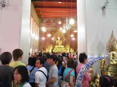 今日の午後、カオサンにあるチャナソンクラン寺に、娘と初詣に行ってきました。お寺にお参りしたり寄進したりすることを、タイ語でタンブン〈徳を積む〉といいます。どの位タンブンするかによって、自分の運勢や来世の生まれまで変えることができると多くのタイ人は信じているようです。今年の人出は、例年よりかなり多いです。バンコク都が、チャナソンクラーン寺を含む市内9ヶ所の有力寺でタンブンして、厄をはらい幸運を招こうというキャンペーンを打ち、無料のシャトルバスも用意しているのと、昨年が赤服騒動などで大変な年だったので、新しい年がいい年になるようにとの庶民の切実な願いもあってこのすごい人出になっているのだと思います。お寺の駐車場の入り口に向かう道は、午後3時半になるのにまだ大渋滞しています。ちにみに9という数字は、現プミポン国王が9世であることに因んでラッキーナンバーとされています。私と娘は、あまりに人出にちょっと引きましたが、せっかく来たからと思いきって人の流れの波の中に潜り込み、手早く参拝をすませてきました。今年は去年よりいい年になりますように。そして、みんなが大過なく健康で過ごせますように。日記を気に入っていただけたら、ぜひクリックをお願いいたします。皆様の応援クリックとコメントにパワーを頂いて、このブログを続けさせて頂いています。最新の人気ブログとの新しい出会いもありますよ。