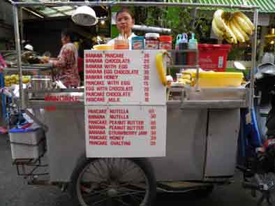 屋台王国タイランド。食事だけでなく、スイーツ屋台もたくさんの種類があります。その中で、私が屋台スイーツの王様だと思うのは「バナナパンケーキ」カオサン通りでも、人種を問わずに大人気です。インド風のローティを鉄板で焼き、たっぷりのバナナを包み込んでバターで風味付け。トッピングはお好みで。私は蜂蜜が大好きです。その他、チョコレートと練乳をたっぷりかけた物もこってり甘くてお気に入り。素朴で安くて美味しい屋台スイーツ。竹串でちょいと突いて、歩きながら頬ばります。チープですけど、香ばしいローティの皮と芳醇なバナナ、そして蜂蜜の甘みが口中にひろがって幸せな気分になれるスイーツです。日記を気に入っていただけたら、ぜひクリックをお願いいたします。皆様の応援クリックとコメントにパワーを頂いて、このブログを続けさせて頂いています。最新の人気ブログとの新しい出会いもありますよ。