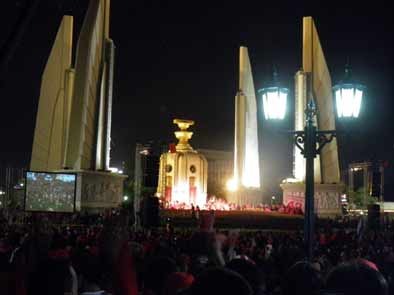 今日もまた赤服大集会が開かれました。今回は、ラチャプラソン交差点には数時間いただけで、夕方、カオサン近くの民主記念塔に大移動。深夜12時まで居座るそうです。すごい人数が動員されています。おそらく数万人いるのでは。。。民主記念塔の周りを赤が埋め尽くしています。まるで赤いOOOOの群れ。周辺は赤いテントの屋台がたくさん並んで縁日みたいです。食べ物、飲み物、赤服グッズ、日用品、雑貨、VCD、路上フットマッサージと、それぞれ盛況です。赤服を着ていない屋台もあるので、赤服支持ではない便乗組もいるようです。ビジネスチャンスを逃さないのはいい事です。お金を稼ぐのは大変なことだから、稼げる時にしっかり稼いでください。竹亭カオサン店は、暇でした。今月はハイシーズンでもあり絶好調ですが、今夜は赤服大集会で急ブレーキです。道路封鎖と、周辺道路が極度に渋滞するのがわかっているから、タイ人のお客さんが来ません。報道によると、今週の火曜日25日にも再び民主記念塔で夜7時から深夜12時まで大集会を開くとの事。しかも、それとは別に敵対関係にあるPAD(黄色)がカンボジア問題でマカワン橋で同じく大集会。同じ日に、赤と黄色がそれぞれ大集会です。タイの未来は、いよいよ不透明さを増してきました。日記を気に入っていただけたら、ぜひクリックをお願いいたします。皆様の応援クリックとコメントにパワーを頂いて、このブログを続けさせて頂いています。最新の人気ブログとの新しい出会いもありますよ。
