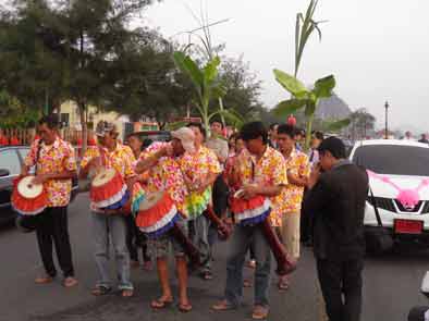 15日(日)、タイ人妻の弟ユッド(30歳)と婚約者クック(28歳)の結婚式が早朝より行なわれました。婚約者のクックはカンチャナブリ出身で、本来なら結婚式は新婦の地元で行なわれるのですが、今回は諸事情により新郎の地元プラチュアップキリカンになりました。新婦のクックは、2日前から海岸沿いのハット・トーンホテルを自宅ということに仮定して泊まっています。新郎一行は歩いて5分ほどの場所を自宅ということにして、そこから、たくさんの引き出物を持って大勢の結婚式参加者と共に行列を作って新婦を迎えにいきます。これはタイ式結婚式に欠かせない儀式です。賑やかな楽隊を先頭に、みんなで「ヘー・ヘー」と大きな声で奇声を上げながら行列は進みます。後ろに見えるバナナの若木は子沢山を願い、サトウキビは繁栄を願うものだそうです。突然の騒ぎに、ホテルに宿泊している外国人が部屋からみんな出てきてベランダから見物したり写真を撮っていました。娘の望が持っているのは、100バーツ札でバラの造花を作った花束です。結婚式会場のホテルに着くと、新婦側の親族が通せんぼをして待っています。これは新郎が彼らにお金の入った袋を渡さないと、新婦に会わせてあげないよと言うことです。後ろのおばさんたちは、通せんぼをしつつ浮かれて踊りだしました。義弟のユッドと新婦のクック。花嫁さんは、一生で一番きれいに輝く日ですね。最大の注目を集める結納金と金のお披露目。息子の晴れの日に、出来るだけのことをしてあげたいという親子心はどの国も一緒ですね。ちなみに司会者は、新郎新婦は力を合わせて頑張ってこの結納金を100倍に増やしてくださいと祝いの言葉を述べていました。最後に、新郎新婦が両親、目上の人や親戚に尊敬の念をこめてお茶を捧げます。この時、招かれた客は新郎新婦に祝いの言葉を述べると共に御祝儀を渡します。これは華僑独特のスタイルだそうです。こうして3時間ほどで式は無事に終わりました。義弟と新婦のクックは、9年越しの交際を実らせました。二人とも気立てのいい性格で私も嬉しいです。この後、夜6時から盛大な披露宴が行なわれましたが、その様子は次の日記で紹介します。日記を気に入っていただけたら、ぜひクリックをお願いいたします。皆様の応援クリックとコメントにパワーを頂いて、このブログを続けさせて頂いています。最新の人気ブログとの新しい出会いもありますよ。