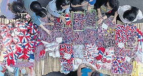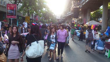 バンコク封鎖も8日目を迎えました。ラチャダムヌンのデモ隊警備員が発砲で負傷した他は大きな動きはありません。また、インラック暫定首相がデモ隊に対する警備をもっと強化するよう指示をだし、警察は昨日の犯人の逮捕につながる情報に50万バーツの懸賞金をかけると発表しました。ところで、日本の友人からのメールでは、外出禁止令や戒厳令も近いのではと報道されているそうですが、現地ではそんな感じはまったくありません。確かに昨日の民主記念塔の手榴弾テロで、これ以上事態がエスカレートするなら非常事態宣言の発令もありうると政府が述べていますが、デモには慣れっこのバンコクっ子たちは通常の生活を送っています。交通渋滞はデモがあってもなくても毎度のことで、みんな適応しています。夕方のシーロム通り。ご覧のとおりすぐ先の交差点がデモで封鎖されているので、一車線が路上マーケットと化してたいそうな賑わいです。OLさんもビジネスマンも学校帰りの学生さんも家族連れも、笑いさざめきながらのんびりと歩いています。近くの大スピーカーからは、デモ隊のアジ演説や歌が大音量で響いていますが、耳を傾けている人はほとんどいないのでは。^^;ちなみにこの通りは、デモがなければ毎夕びっしりと渋滞する通りです。娘の望にせがまれてデモ隊シンボルの笛と、タイ国旗のステッカーを買ってあげました。「ナー・ラック」(可愛い)と喜んでいます。^^万が一のことがあるからデモ隊には近づくなというのは、全くその通りの正論です。でも、当のタイ人達はこんなにのんびりしているというのも本当です。もし、この日記を楽しんで頂けたら、下の3つのブログランキンのアイコンにぜひ応援クリックをお願いいたします。皆様から頂く貴重な一票とコメントを励みに更新しています。^^どうぞよろしくお願いいたします。 竹亭の宣伝です。^^バンコクで日本の味が恋しくなったら竹亭へぜひどうぞ。手頃な値段でほっとする味をお楽しみください。160バーツからの定食類は昼も夜も同じ値段。おつまみも多数、居酒屋的利用もお座敷で宴会も出来ます。ガッツリ食べたい時は、名物481バーツの食べ放題をどうぞ。タイ人スタッフとの新年会、パーティーにも最適です。低予算で大満足してもらえますよ。シーロム・ソイ10店(電話02-234-2345)、バンラック店(電話02-233-0384)