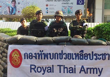 昨日、行われたインラック暫定首相と選挙管理委員会の投票日に関する会議の結論が出ました。予定通り2月2日、投票決行だそうです。一部には、投票を3,4ヶ月間延期するのではという観測もありましたが、衝突や騒乱が心配される結果となりました。暫定政府としては、今回の選挙をボイコットしている民主党が改めて選挙に参加するなら投票日を延期してもいいという立場だったようですが、民主党はあくまで総選挙の前に評議会による政治改革(要するにタクシン派一掃)を主張していて物別れに終わりました。ところで、会議が行われていた陸軍クラブでインラック暫定首相に対する抗議活動をしていたデモ隊が、白昼、また発砲されて負傷者が2名出ました。今回は、デモ隊の警備員が逃走する犯人の確保に成功して袋叩きにしたところ、犯人は現職の警察官だったそうです。また、昨日の早朝、チャトチャック地区でデモグッズを身に着けたデモ隊参加者と想われる41才の男性の射殺体が発見されています。遺体には暴行を受けた跡があったそうです。投票日まであと5日。反政府デモ隊は再び投票妨害に出ると思われますし、軍も騒乱が起るのを心配しています。この時期に、デモ会場や投票所に近づくことはリスクを伴ないますのでご注意ください。それから、こちらの法律により2月1日の夕方6時から2日の深夜12時までアルコール類の販売が禁止になります。バンコク銀行本店前の土嚢の陣地で睨みをきかす兵隊さん。実は、写真を撮ってもいいですかとお願いしたら、それまで寛いでいたのに急に立ち上がってポーズを決めてくれました。^^私がお礼を言うと、微笑みながらさっと敬礼を返してくれました。(かっこよかったです^^)サラデンのデモ会場は、フォークコンサートで盛り上がっていました。相変わらず緊張感はゼロ。。。もし、この日記を楽しんで頂けたら、下の3つのブログランキンのアイコンにぜひ応援クリックをお願いいたします。皆様から頂く貴重な一票とコメントを励みに更新しています。^^どうぞよろしくお願いいたします。 竹亭の宣伝です。^^バンコクで日本の味が恋しくなったら竹亭へぜひどうぞ。手頃な値段でほっとする味をお楽しみください。160バーツからの定食類は昼も夜も同じ値段。おつまみも多数、居酒屋的利用もお座敷で宴会も出来ます。ガッツリ食べたい時は、名物481バーツの食べ放題をどうぞ。タイ人スタッフとの新年会、パーティーにも最適です。低予算で大満足してもらえますよ。シーロム・ソイ10店(電話02-234-2345)、バンラック店(電話02-233-0384)