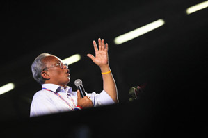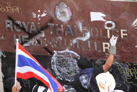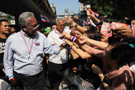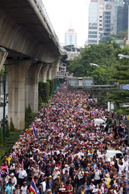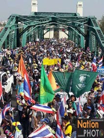 バンコク封鎖もはや10日目を迎えました。昨日、非常事態宣言が発令されたことは、日本でも大きなニュースになったようですね。一連のデモによる影響で、欧米諸国からの観光客だけでなく、1月31日の中国正月(業者にとってはかき入れ時)を前に、中国、香港、シンガポールなどからの観光客も激減して、非常事態宣言が観光産業に与える減収は100億バーツにのぼると試算されているそうです。ところで、非常事態宣言というといかにも物々しい感じがして、街角に警戒の兵士でも立っているかのようなイメージがあるかもしれません。しかし、タイの場合は違います。街は平常通りです。市民もごく普通の生活を営んでいます。デモ隊に近づかなければ、まったく平静な一日です。観光、買い物も普通にできます。Bangkok Postしかし、反政府デモ隊は参加人数こそ減っていますが、5人以上の集会を禁ずる非常事態宣言を無視して活発に活動しています。バンコクでは、ムアントンの平和管理センター、航空局、警察本部などを包囲して、警察本部では塀の看板の文字を剥がしてしまいました。地方各地でも県庁を包囲した他、ピチット県では政府からいまだに米代金を支払ってもらえない農民達が幹線道路を封鎖して、数日中にバンコクの反政府デモ隊に合流する構えも見せています。今のところ、治安部隊も静観の構えというか手が出せないのでしょう。しかし、デモ隊が暴走して政府施設に乱入占拠を企てた場合は、また衝突が起る恐れがあります。夕方6時半、ルンピニ公園のデモ会場にいってみました。ちょうど指導者のステープ氏がステージで演説をしているところでした。手を打ち鳴らし笛を吹きながら耳を傾けているのは約1000名位のデモ隊。それ以外に、会社帰りらしいビジネスマンやOLさんの姿も目につきました。それしても、ステープ氏はタフですね。孫のいる年なのに、もう3ヶ月近くもデモ隊を率いて休日なしで活動しています。どれほどの蓄積疲労とストレスにさらされているのか私には想像もつきませんが、ステージのステープ氏はなおエネルギッシュで意気軒昂でした。私は感心しながらも心の中で「自分の要求ばかりごり押しする(話し合いで妥協点を見つけようとしない)頑固ジジイめ」と呟きましたけど。^^;もし、この日記を楽しんで頂けたら、下の3つのブログランキンのアイコンにぜひ応援クリックをお願いいたします。皆様から頂く貴重な一票とコメントを励みに更新しています。^^どうぞよろしくお願いいたします。 竹亭の宣伝です。^^バンコクで日本の味が恋しくなったら竹亭へぜひどうぞ。手頃な値段でほっとする味をお楽しみください。160バーツからの定食類は昼も夜も同じ値段。おつまみも多数、居酒屋的利用もお座敷で宴会も出来ます。ガッツリ食べたい時は、名物481バーツの食べ放題をどうぞ。タイ人スタッフとの新年会、パーティーにも最適です。低予算で大満足してもらえますよ。シーロム・ソイ10店(電話02-234-2345)、バンラック店(電話02-233-0384)