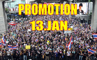 1月13日(月)バンコクを封鎖するという大反政府デモが予定されている日です。竹亭のあるシーロムとバンラックの交差点も封鎖予定地に入っています。バンコクっ子は、この日何が起るのか戦々恐々としています。そこで、この反政府デモを逆手にとってプロモーションをかけることにしました。名づけて「Promotion 13.JAN.」この日は食べ放題、定食、アラカルトの全てのフードメニューを全品10%引きとさせて頂きます。交差点封鎖で道は混むでしょうが、竹亭2店にはBTSで行くこともできます。シーロム・ソイ10店は、チョンノンシー駅、サラデン駅から歩いて9分。バンラック店は、サパーンタクシン駅から歩いて3分です。このプロモーションをFace Book(右クリック)で告知したところ、想像以上の反響がありました。アップ後約6時間で184のいいね!37のシェア、閲覧してくれた人は9300人以上です。当日、実際にどれ位のお客さんが来てくれるのかは未知数ですが、少なくともお店のいい宣伝にはなったかな。しかもかかった宣伝費はゼロです。^^ご予約:シーロム・ソイ10店 02-234-2345 バンラック店 02-233-0384どうぞよろしくお願いいたします。もし、この日記を楽しんで頂けたら、下の3つのブログランキングのアイコンにぜひ応援クリックをお願いいたします。皆様から頂く貴重な一票とコメントを励みに更新しています。^^どうぞよろしくお願いいたします。 竹亭の宣伝です。^^バンコクで日本の味が恋しくなったら竹亭へぜひどうぞ。手頃な値段でほっとする味をお楽しみください。160バーツからの定食類は昼も夜も同じ値段。おつまみも多数、居酒屋的利用もお座敷で宴会も出来ます。ガッツリ食べたい時は、名物481バーツの食べ放題をどうぞ。タイ人スタッフとの新年会、パーティーにも最適です。低予算で大満足してもらえますよ。