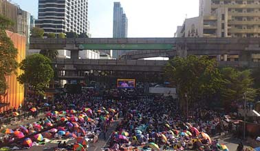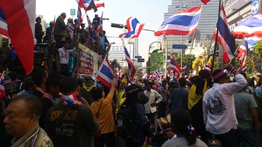 とうとう反政府デモ隊によるバンコク封鎖が始まりました。昨日の朝はいつもより30分早く家を出たのですが、予想に反して道はガラガラ。大渋滞を心配して仕事を休んだ人も多かったようです。でも、シーロム店に到着して10分後には、反政府デモ隊の第一陣がシーロム通りにやってきました。みんなニコニコと楽しそう。沿道のタイ人たちも、それぞれ手を振ったりスマホで写真を撮ったりと歓迎ムード。例によって明るく楽しいデモの始まりです。夕方のシーロム、ラマ4交差点は、デモ隊に完全に占拠されていました。交差点のど真ん中や路上に敷いたビニールシートの上に腰掛けて、演説に耳を傾け歓声を上げ笛を吹き鳴らしています。その様子だけ見ていたら、自動車は走っていないし歩行者天国でピクニックしているみたいです。赤服デモ隊が道路封鎖していた時は、血や怒りを連想させる赤一色で圧迫感がすごかったけど、このデモ隊は平和的です。(やっていることは似たようなものですが)なお、この交差点にのべ何万人が集まったのかはわかりませんが、サイアム地区、アソークにはもっと大勢集まっているそうです。アソークと言えば近くにソイ・カウボーイがあるけど、デモ隊が笛を吹きながら歩いていたら面白いな^^でもこれは、お祭りではありません。いったいあと何日続くのか。見通しは全く立ちません。インラック暫定政権が総辞職するまで続けるそうですが、今のところ、辞職するつもりは全く無いようで、反政府側に総選挙の延期についてなら話し合おうと言っているようです。ちなみに、先日お知らせしたフード全品10%引きのプロモーションですが、お陰様でランチタイムは盛況でした。夜はそこそこ。でも、少しでも売り上げがプラスできて良かったです。来ていただいたお客様に感謝です。もし、この日記を楽しんで頂けたら、下の3つのブログランキングのアイコンにぜひ応援クリックをお願いいたします。皆様から頂く貴重な一票とコメントを励みに更新しています。^^どうぞよろしくお願いいたします。 竹亭の宣伝です。^^バンコクで日本の味が恋しくなったら竹亭へぜひどうぞ。手頃な値段でほっとする味をお楽しみください。160バーツからの定食類は昼も夜も同じ値段。おつまみも多数、居酒屋的利用もお座敷で宴会も出来ます。ガッツリ食べたい時は、名物481バーツの食べ放題をどうぞ。タイ人スタッフとの新年会、パーティーにも最適です。低予算で大満足してもらえますよ。シーロム・ソイ10店(電話02-234-2345)、バンラック店(電話02-233-0384)