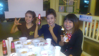 金曜日の夜、仕事が終わった後に竹亭スタッフ全員がバンラック店に集まって恒例の新年パーティーを行いました。みんな酔っ払って大騒ぎです。女性陣はスパイという甘いスパークリングワインがお気に入り。普段は大人しいタイプのウエイトレスまで、キャーキャーはしゃいでいました。やがて照明が落とされルーク・トゥンというタイのリズミカルな民謡が大音量で流れ出すと、全員席を立って飛び跳ねるように踊りだします。南国のノリの良さ。そして、みんな若いです。私はビールを飲みながらにこにこと踊るみんなを眺めていました。20代の頃は一緒に踊ったものですが。^^新しい一年がまた始まりました。また様々なドラマや事件が起ることでしょう。^^みんな楽しみながら元気に無事に過ごしてほしいです。そしてまた、たくさんのお客様から笑顔のご褒美を頂けるよう顔晴ります。もし、この日記を楽しんで頂けたら、下の3つのブログランキングのアイコンにぜひ応援クリックをお願いいたします。皆様から頂く貴重な一票とコメントを励みに更新しています。^^どうぞよろしくお願いいたします。 竹亭の宣伝です。^^バンコクで日本の味が恋しくなったら竹亭へぜひどうぞ。手頃な値段でほっとする味をお楽しみください。160バーツからの定食類は昼も夜も同じ値段。おつまみも多数、居酒屋的利用もお座敷で宴会も出来ます。ガッツリ食べたい時は、名物481バーツの食べ放題をどうぞ。タイ人スタッフとの新年会、パーティーにも最適です。低予算で大満足してもらえますよ。