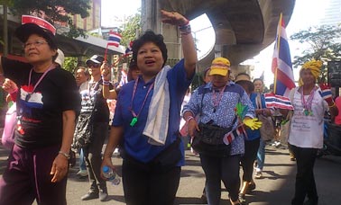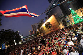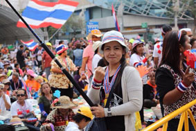 バンコク封鎖2日目も、衝突なく無事に終わりました。それを受けて株価とタイバーツも上昇しています。シーロム通りは、人通りこそまだ少ないですが、お昼に会社員がランチに繰り出しいつもの光景が戻ってきました。シーロム・ラマ4交差点はデモ隊により閉鎖されたままですが、そこまで行かなければデモが行われている事も忘れそうです。昨日、私はセントラルワールドと伊勢丹のあるラチャプラソン交差点に行ってきました。ここも反政府デモ隊に占拠されていますが、警備の治安部隊の姿もなくのんびりムードのデモ会場です。主に民主党の地盤である南部から集まってきた(集められた?)人たちが、天幕の下に敷かれたビニールシートやテントの中で寝泊りしています。レストラン経営の支持者による無料食事配給。長蛇の列ができていました。タイのおばちゃんも元気です。^^正面ステージでは、演説が終わった後、コンサートが始まりました。カントリー調にノリのいい音楽に、みんな総立ち。老いも若きもその場で踊りはじめます。南国人は陽気です。ところでNATION紙の報道によると、インラック暫定首相が政治にはもう疲れ果てたと辞任しようと考えたらしいですが、発表する直前に兄であるタクシン氏にスカイプで慰留されて思いとどまったそうです。今辞めたら、憲法で規定されている総選挙まで暫定政権を運営する義務を放棄したことになり、あとで反対派に憲法違反で糾弾されて有罪にされるぞと言われたそうです。同紙の記者が、どうしてそこまで見てきたように詳しい事情を知っているのだろうかと不思議に思いましたけど。^^;なお、反政府デモ隊はあくまでインラック暫定政権の辞任を求め、総選挙日程変更などの話し合いに応じるつもりは一切ないとの姿勢を崩していません。そして15日は、アソーク交差点集結のデモ隊が、トンロー、エカマイ、ペップリー通りを行進して更なるデモ参加者を募るそうです。ただでさえ混んでいるスクンビット、ペッブリ通りは交通麻痺必至です。私はスクンビットに用事があるけど、延期して近づかないことにします。(汗)もし、この日記を楽しんで頂けたら、下の3つのブログランキングのアイコンにぜひ応援クリックをお願いいたします。皆様から頂く貴重な一票とコメントを励みに更新しています。^^どうぞよろしくお願いいたします。 竹亭の宣伝です。^^バンコクで日本の味が恋しくなったら竹亭へぜひどうぞ。手頃な値段でほっとする味をお楽しみください。160バーツからの定食類は昼も夜も同じ値段。おつまみも多数、居酒屋的利用もお座敷で宴会も出来ます。ガッツリ食べたい時は、名物481バーツの食べ放題をどうぞ。タイ人スタッフとの新年会、パーティーにも最適です。低予算で大満足してもらえますよ。シーロム・ソイ10店(電話02-234-2345)、バンラック店(電話02-233-0384)
