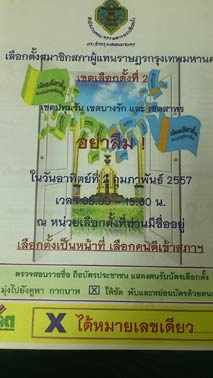 今年のタイの30年振りの寒波もようやく峠を越したようです。昨日は最低気温21度、最高気温33度ととても快適な気候でした。これから4月の猛暑期に向け、気温はどんどん上がっていくのでしょう。私は寒いより暑いほうが好きです。^^さて、バンコク封鎖17日目。後3日で投票日です。政府側は、反政府デモ隊に国民の投票を妨害しないよう話し合いを求めていますが、ステープ氏は木曜日より再びデモ行進を再開して、投票日の2日にはバンコクを完全に封鎖して、道はホコ天となり人々は投票に行かなくてもよい、とサラデーンデモ会場で演説したそうです。一方政府は、投票日には警察だけでなく軍にも治安維持の協力を要請しています。なお、29日未明にラドプラオのデモ会場にまた手榴弾が投げこまれ、1名が負傷しています。また昨日、シーロム店に投票の手引きが配られてきました。投票準備も着々と進んでいます。もし、この日記を楽しんで頂けたら、下の3つのブログランキンのアイコンにぜひ応援クリックをお願いいたします。皆様から頂く貴重な一票とコメントを励みに更新しています。^^どうぞよろしくお願いいたします。 竹亭の宣伝です。^^バンコクで日本の味が恋しくなったら竹亭へぜひどうぞ。手頃な値段でほっとする味をお楽しみください。160バーツからの定食類は昼も夜も同じ値段。おつまみも多数、居酒屋的利用もお座敷で宴会も出来ます。ガッツリ食べたい時は、名物481バーツの食べ放題をどうぞ。タイ人スタッフとの新年会、パーティーにも最適です。低予算で大満足してもらえますよ。シーロム・ソイ10店(電話02-234-2345)、バンラック店(電話02-233-0384)