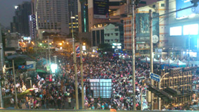 バンコク封鎖4日目です。相変わらずデモ行動は続いていますが、特に大きな進展はありません。こう着状態です。午前11時。竹亭近くのITFビルに反政府デモ隊およそ1000名が集結しました。その目的は、このビルに入居している税務局のオフィスに圧力をかけるためです。バンコクの他の税務局にもデモ隊が行っていると思われますが、税務職員に仕事を放棄して国家のために反政府活動に参加しなさいみたいな事をアジ演説していました。(そんな事をしても圧力効果はあるのかな)このデモの参加者は、身なりから南部タイの人たちのようです。緊張の色を隠せないビルの警備員。隣では同ビルで働くOLさん達がデモ隊応援の笛を吹いていました。近くのオートバイタクシーのおじさんは、愛国グッズ即売のアルバイトです。^^このデモは45分ほど続いて近くのサラデン交差点デモ会場に去っていきました。その後、午後2時にはシーロム通りを2000名ほどの別のデモ隊が行進しました。シーロムの人達の反応ですが、初日の13日はみんな手を振ったりして歓迎ムードがありましたが、今回はしらっとしているビジネスマンやOLの姿が目についたように思います。みんな仕事があるから、デモにばかりかまけていられません。私が毎日果物を買っている屋台のおばちゃんが、隣の屋台のおばちゃんと、道路封鎖で市場に仕入れに行くのが大変になったねとぼやいているのが聞こえました。 シーロムのサラデン駅から眺めたデモ会場方面。愛国グッズの露店や食べ物屋台がたくさん出て、お祭り会場にしか見えません。今回のバンコク封鎖デモは、インラック暫定政権の息の根を止めかねない騒乱を恐れてか警察も遠巻きに見守っているだけで、昼間は緊張とは程遠いのんびりムードが漂っています。(夜間は別ですが)でも、こんな状態はいつまでも続きません。いつか必ず終わる時がきます。どんな結末になるのか様々なシナリオが考えられますが、反政府デモ隊指導者とインラック暫定政権とタクシン氏は、一体どんな絵を書こうとしているのか。もし、この日記を楽しんで頂けたら、下の3つのブログランキングのアイコンにぜひ応援クリックをお願いいたします。皆様から頂く貴重な一票とコメントを励みに更新しています。^^どうぞよろしくお願いいたします。 竹亭の宣伝です。^^バンコクで日本の味が恋しくなったら竹亭へぜひどうぞ。手頃な値段でほっとする味をお楽しみください。160バーツからの定食類は昼も夜も同じ値段。おつまみも多数、居酒屋的利用もお座敷で宴会も出来ます。ガッツリ食べたい時は、名物481バーツの食べ放題をどうぞ。タイ人スタッフとの新年会、パーティーにも最適です。低予算で大満足してもらえますよ。シーロム・ソイ10店(電話02-234-2345)、バンラック店(電話02-233-0384)