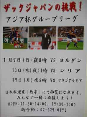 幸いタイでもテレビ中継があるので、竹亭にて 日本戦を全戦放映 いたします。