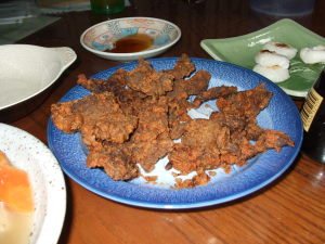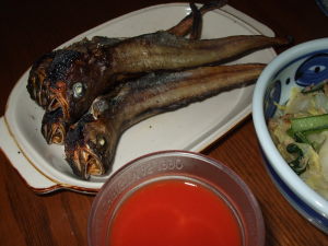 好きです タコはは 好きです タコはは好きです タコはは 好きです タコははいらっしゃいませー ようこそ 「居酒屋 タコはは」 へ何名様ですか?ハイ 4名様 お席の方へご案内致しまーす。それでは本日のおすすめメニューのご案内をさせて頂きまーす。本日のおすすめは 「トリ蒲焼」 です。下味に一日ほど漬けておき、250°のオーブンで25分焼いて、油がすっかり抜けてヘルシーですよ。油がこんなに出ました!それからタコちちが 「伊達の唐揚げ屋さん」 の 「レバーのから揚げ」 を買って来てくれたのでさっそく頂きましょう。甘味のあるタレがからんでまいうーでした。それから 「寒締めホウレンソウの御浸し」 も有りますよ。以外に葉っぱがしっかり、甘味も強くて美味しいです。お飲み物はお決まりですか?はい 生ビール4つお願いしまーす。好きです タコはは 好きです タコはは好きです タコはは 好きです タコははあら タコちゃん いらっしゃいませー 何だか中が見えないけど、ちゃんと準備してるんですかなんだっけ 「埋蔵金」 の場所だって知ってるんだぞそれって、買い置きしてあるジャーキーの事かなこれに 「定額給付ジャーキー」 入れて下さーい家にはキャサリンとジェニファーとキムタコとタコと・・・・・だからたっぷりね。今夜は世情には意外に詳しいタコちゃんがいつの間にかタコ江さんになってる 「北の田舎町の居酒屋さん」 メニューでした。タコははの手帳より「平成18年1月13日 ダイエット12ヶ月13日目夕食メニュー」ふろふき大根、残り物(野菜炒め)、トマトジュース体重57.6