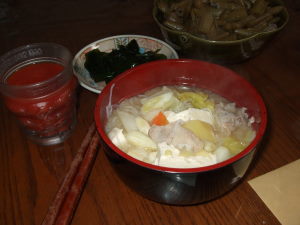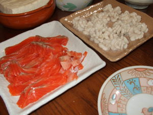 いらっしゃいませ ようこそ 小料理 タコははへ!美人???ブヒ! 女将のタコははです。どうぞ ごひいきに さあさあ カウンターの席にどうぞ! 最初のおすすめは 「お刺身」 です。今夜はサーモンと白子です。この白子は軽く湯通しして、冷たい水で締めて、刻みネギとポン酢に一味唐辛子少々でお召し上がり下さい。まったりと濃厚な味はお酒のつまみには最高ですよ。それから 「湯豆腐」 もどうぞ。冬越しした柔らかくて美味しいネギがあるので、このネギの美味しさを引き出すのはやっぱり湯豆腐ですよね。風邪予防にもたっぷり入れてお召し上がり下さい。その他に 「切干大根とワカメの酢の物」 と 「松前漬け」 も作りました。切干大根をたっぷり戻したので、半分を酢の物、残りは松前漬けに入れました。コリコリした歯ごたえがいいですよ。あら タコちゃん いらっしゃいませー 午後から雪が降り出し、夕方には本格的になって 「なごり雪」 になりましたね。汽車を待つ君の横でボクは~♪動き出した汽車の窓に顔を付けて~♪いま春が来て君は綺麗になった~♪今夜はあの名曲を知ってるタコちゃんがいつの間にかタコ江さんになってる 「北の田舎町の小料理屋さん」 メニューでした。タコははの手帳より「平成18年2月3日 ダイエット13ヶ月3日目夕食メニュー」太巻き、タラちり、トマトジュース体重57.4