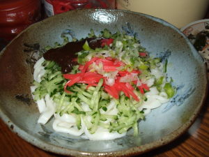 好きです タコはは 好きです タコはは好きです タコはは 好きです タコははいらっしゃいませー ようこそ 「居酒屋 タコはは」 へ 何名様ですか?ハイ 4名様 お席の方へご案内致しまーす。それでは本日のおすすめメニューのご案内をさせて頂きまーす。本日のおすすめは 「盛岡じゃじゃ麺」 です。 「盛岡名物じゃじゃ麺」 をうれしい半額セールでゲットして、賞味期限が今日までですから、キュウリの千切り、ネギ、紅ショウガにお好みでニンニク、お酢をかけてどうぞお召し上がり下さい。それから 「切干大根とワカメの酢の物」 はいかがでしょうか。今回は黒糖で作った甘酢に戻した切干大根、ニンジン、ワカメを入れたら、なかなか美味しくできました。その他に 「イカの沖漬」 「おいしい沢庵」も有りますのでどうぞ宜しくお願いします。お飲み物はお決まりですか?はい 生ビール4つお願いしまーす。好きです タコはは 好きです タコはは好きです タコはは 好きです タコははあら タッパーさん いらっしゃいませー ゆっくりしていって下さいねすぐ帰るもんホントにもう帰るもん なんちゃって、今夜は照れ屋のタッパーさんがしっかりくつろいでいる 「北の田舎町の居酒屋さん」 メニューでした。タコははの手帳より「平成18年2月8日 ダイエット13ヶ月8日目夕食メニュー」ワンタン、トリ皮パリパリ揚げ、トマトジュース体重57.0