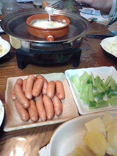 好きです タコはは 好きです タコはは好きです タコはは 好きです タコははいらっしゃいませー ようこそ 「居酒屋 タコはは」 へ何名様ですか?ハイ 4名様 お席の方へご案内致しまーす。それでは本日のおすすめメニューのご案内をさせて頂きまーす。本日のおすすめは 「チーズフォンデュ」 です。電気の鍋でお湯を沸かして湯煎にしてチーズを温めてみたら意外にも使えますよ。白ワインを温めてナチュラルチーズをちぎって入れて、湯煎で温めながらゆっくりかき混ぜてとろとろに溶かて、塩少々で味付けしました。具材はジャガイモ、ブロッコリーの茎、粗挽きウインナーと有り合わせとなっておりますが、どれもまいうーですよそれからお肉屋さんの 「トリ唐揚げ」 はいかがでしょうか。翌日に残らない程度にニンニクの香りの下味が美味しくて時々お助けメニューになってますが、オーブンで焼いて油を出して、キャベツの千切りも添えて頂きましょうね。そして 「白ワイン」 も有りますよ。 チーズフォンデュ用ですが、野球観戦しながらちびちびと頂きましょう。お飲み物はお決まりですか?はい 生ビール4つお願いしまーす。好きです タコはは 好きです タコはは好きです タコはは 好きです タコははいらっしゃいませー あら タコ監督さん 今夜は1位決定戦ですよ。先発はタコダァーーー 今夜は再び日韓戦の先発を強気で発表したタコ監督が訪れた 「北の田舎町の居酒屋さん」メニューでした。タコははの手帳より「平成18年1月18日 ダイエット12ヶ月18日目夕食メニュー」残り物(白菜たっぷり鍋(春雨、トリ団子等)、トマトジュース体重57.4