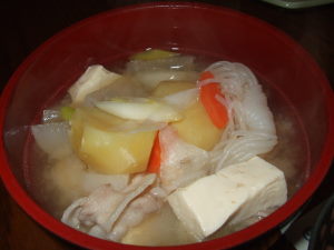 いらっしゃいませ ようこそ 小料理 タコははへ!美人???ブヒ! 女将のタコははです。どうぞ ごひいきに さあさあ カウンターの席にどうぞ! 最初のおすすめは 「野菜たっぷりの豚汁」 です。今日はジャガイモを入れたとん汁が食べたくなったので、大きく乱切りしたジャガイモに大根、人参、キャベツ、豚肉、糸コン、豆腐、ネギと具沢山にしました。昨日の湯どうししたワカメもいっしょにいれてジャガイモとワカメのコラボがまいうーですよ!それから定番の 「蕗の炒め煮」 もありますよ。美味しくできたので、ご飯にも、お弁当にも入れて暫く楽しめますね。 その他に 「ヒジキの煮物」 はいかがでしょうか。芽ヒジキを戻して、人参、油揚げ、糸コンを入れ、醤油、砂糖、味醂、化学調味料であっさり系の味付けにしました。炊き立てのご飯と合わせてひじきご飯にしてもいいですね。ついでに 「メザシ」 も焼いて置きました。頭とハラワタをキッチンバサミでカットしてから焼くと綺麗に焼き上がりますよ。メザシといえば朝ご飯が定番ですが、最近は薄塩タイプなのでレモン汁をかけてカルシウムたっぷりのいい酒の肴になるんですよ。毎週土曜日に見ている韓国ドラマ 「ファン・ジニ」 が今月で終わるので今週は二話の放送らしいとタコちちに話したら、この先どうなるんだ?と言うので、HPで予告を見たタコははが、これからこうなって、あの人はこうなって等と二話分を説明しようとしたら、楽しみがなくなるからもういいだってさ!さっきどうなるんだって聞くから説明しているんですけど別に全部見て内容を説明する訳じゃなくて、あくまでも予告編、つまり予習ですから予習しておくと安心して見れるじゃないですか。どうも最近は手に汗握るような、ハラハラ、ドキドキは疲れるので、タコはは的にはそうそうこうなるんだよねー、ほらほら来たぞー、ここはこうだったでしょーってな具合に復習しながらじっくり見るタイプなんです。あら タコちゃん いらっしゃいませー アレの場所はもう知ってますヨ今夜はジャーキーの予習は完璧なタコちゃんが訪れた 「北の田舎町の小料理屋さん」 メニューでした。タコははの手帳より「平成18年1月21日 ダイエット12ヶ月21日目夕食メニュー」鳥団子鍋、トマトジュース体重57.6