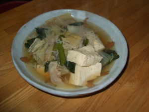 いらっしゃいませ ようこそ 小料理 タコははへ!美人???ブヒ! 女将のタコははです。どうぞ ごひいきに さあさあ カウンターの席にどうぞ! 最初のおすすめは 「肉豆腐」 です。今日は豚シャブ用のお肉に白菜、糸コン、豆腐をあっさり系に味付けしてみました。野菜不足を補って白菜をたっぷりにしました。それから 「トリのさっぱり煮」 もありますよ。トリは一度湯がいてから、醤油、砂糖、味醂、塩コショウでタレをからめながらとろ火で煮込んで最後に酢を入れ好みの酸味にして、ゆで卵を入れ全体にタレからめて出来上がりです。名前の通り、お酢の酸味がさっぱりしてなかなかいいですよ。今タコ家は出窓のラン達が花盛りでいいかほりです。 あら タコちゃん いらっしゃいませー 花のかほりに誘われて春の歌なんかいかがですか?あうー あうー 今夜はあの春の歌を知ってるタコちゃんが訪れた 「北の田舎町の小料理屋さん」 メニューでした。タコははの手帳より「平成18年1月26日 ダイエット12ヶ月26日目夕食メニュー」残り物(とん汁、カレー)、もやしとワカメの和え物、トマトジュース体重57.6