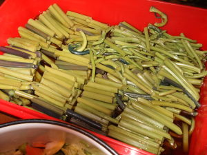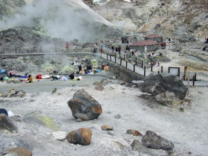 今日は秋田の玉川温泉へ岩盤浴に行ってきました。ここ玉川温泉は地熱の高い地獄地帯での岩盤浴と北投石が有名で朝早くから大勢の岩盤浴客がそれぞれお気に入りの場所にゴザを敷き地熱で体を癒していました。一番の湧出口の 「大噴」 からは98℃のお湯がボコボコ、バシャバシャと怒り狂ったようにお湯を湧き出していました。(湯気でよく見えないか。)GWで混雑しそうですから早めにタコ家を出発してちょっとだけ渋滞しましたが、10時には硫黄の吹き出し口近くで地熱も十分な場所にゴザを敷く事が出来ました。ゴザの上に寝そべって下からじわじわ温められると、いつの間にか深い眠りに落ちて、結構汗もかくので体からスーッと疲れが取れる感じに皆さん 「ハマ」 るんでしょうね。右端に半分見えますのは岩盤浴中のタコ姉さんでございまーす。常連さんから岩盤浴のもう一つのお楽しみを教えていただきました。大きな吹き出し口にお芋、卵、ニンニク等をネットに入れ木の枝に下げる蒸し料理です。こちらのネットの中はサツマイモが入れられて下げられていましたよ。次回は岩盤浴グッツ&お芋か卵etc・・・・等完璧にするぞ と深く心に誓い無事タコ家に帰り着きましたとさ!タコははの手帳より「平成18年3月12日 ダイエット14ヶ月12日目夕食メニュー」焼き豆腐のお煮付け、トマトジュース体重57.0