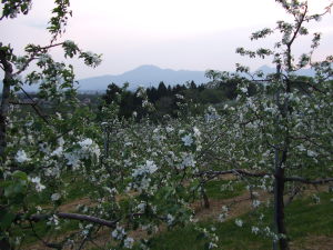 春先から脂肪燃焼を目論んでアップダウンの有るりんご畑コースを朝晩散歩していますがちょうどお花が満開となり見ごろを迎えましたよ。赤い蕾がだんだん開いて白いお花になるみたいです。ウン十年生きていますがりんごのお花って以外に大きい事に気が付きました。ずーっと向こうまで咲いてるよ春一番から枝打ちして、せっせと下草を刈り込んで、どうしても特大の 「ガチャピン」 に見える赤い機械で薬剤散布して、花を摘む摘花をしてと、朝早くから夕方まで沢山の手間をかけて大事に育てていらっしゃいますね。そして、今度は受粉作業の派遣さん?が箱の中で出番を待っているようです。何もしなければ刺されないと思いますが・・・・以前、家庭菜園のキュウリに小さな蜂の巣を発見したので撤収しようとしたら右手の甲を刺されて、ゴム手袋に空気入れて膨らました時のように腫れて病院で点滴した事があり、次に刺された時は危険ですよとも言われましたので暫くこの散歩コースは休んだ方がいいかもしれませんね。お家の中でもオレンジの薔薇を母の日のプレゼントに一足早く、長男夫婦から頂きました。それからタコお孫ちゃんの可愛いお写真が入ったフレームのプレゼントもありがとねタコははの手帳より「平成18年3月16日 ダイエット14ヶ月16日目夕食メニュー」ゴーヤチャンプルー、トマトジュース体重56.2