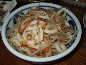 好きです タコはは 好きです タコはは好きです タコはは 好きです タコははいらっしゃいませー ようこそ 「居酒屋 タコはは」 へ 何名様ですか?ハイ 4名様 お席の方へご案内致しまーす。それでは本日のおすすめメニューのご案内をさせて頂きまーす。本日のおすすめは 「もやしとちくわの和え物」 です。最近もやしが見直されてきているそうですね。安くて栄養たっぷりなんですが、なかなかお代りしたくなるほど美味しいメニューは無いんですよ、これが!マンガだけど料理のお手本として使える 「美味しんぼ」 で紹介した 「錦糸玉子ともやしの和え物」 も、錦糸玉子と手間をかけてヒゲを取ったもやしを塩コショウで和える物でさっそく作ってみたけど、まぁこんなもんかな! しかーし、今日はタコはは絶賛の自信作ですよ、奥さん材料もやし、ちくわ、冷やし中華のタレ作り方1 鍋に約1センチのお湯を沸かして、もやしを入れ蒸し煮して、ざるに揚げ水分を切る。2 ちくはを斜め3~4ミリに切り、もやしと冷やし中華のタレで和えて出来上がり。取り合えず在庫処分で作ってみたら 「おやまぁグーじゃん」 で、あっという間に 「完食」 してリピート間違いなしと言う訳でした。 それから 「生姜焼き」 です。豚しゃぶ用のお肉を湯通して、玉ねぎと炒めて生姜、醤油、砂糖、化学調味料で味付けして、細くて茶色いのはこの間のコンニャクステーキで残った玉ねぎスライスをリサイクルしたら甘味が出て美味しく出来ましたよ千切りキャベツをたっぷり添えてどうぞお召し上がり下さい。お飲み物はお決まりですか?はい 生ビール4つお願いしまーす。好きです タコはは 好きです タコはは好きです タコはは 好きです タコははあら タコちゃん いらっしゃいませー 今日の 「もやしの和え物」 は大人気で久々のメガヒット間違いなしですよ壁ぎわに~♪・・・ (知ってるの?)今夜はあのヒット曲を知っているタコちゃんが訪れた 「北の田舎町の居酒屋さん」 メニューでした。 (ジュリ~~~~~ってか)タコははの手帳より「平成18年3月23日 ダイエット14ヶ月23日目夕食メニュー」春雨ともやしの炒め物、トマトジュース体重57.6