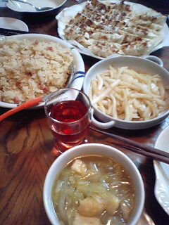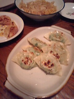 好きです タコはは 好きです タコはは好きです タコはは 好きです タコははいらっしゃいませー ようこそ 「居酒屋 タコはは」 へ 何名様ですか?ハイ 4名様 お席の方へご案内致しまーす。 本日のお品書きのご案内をさせて頂きます。 「ニラ餃子」 「ピザ餃子」 「白菜の中華和え」 「トマトジュース」 をご用意致しました。今晩は手作り餃子でお楽しみ下さい。さてさて冷凍庫の在庫も乏しくなり、餃子が食べたくなったのでやっとスーパーに買い出しに行って、ニラたっぷりに鶏ひき肉、おからも入れた大判タイプの餃子を作りました。そして残った皮でタコ姉さんがピザ餃子も作りましたよ。それから蒸し白菜の細切りを中華ドレッシングで和えた中華和えもどうぞお召し上がり下さい。今夜はがいいですね。好きです タコはは 好きです タコはは好きです タコはは 好きです タコははあら タコちゃん いらっしゃいませー 今日、やっと買い出し行ってきましたよ。只今、子守り中です今夜はちょっと緊張のタコちゃんが訪れた「北の田舎町の居酒屋さん」メニューでした。タコははの手帳より「平成18年11月21日 ダイエット22ヶ月21日目夕食メニュー」キムチ鍋、大根ピリ辛炒め、トマトジュース体重58.2