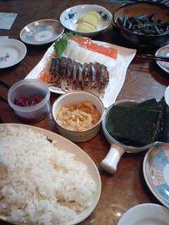 好きです タコはは 好きです タコはは好きです タコはは 好きです タコははいらっしゃいませー ようこそ 「居酒屋 タコはは」 へ 何名様ですか?ハイ 4名様 お席の方へご案内致しまーす。 本日は手巻き寿しでお楽しみ頂きます。今日は珍しいサバのたたき、サーモン、エンガワの3パック¥1000のネタにウニイカ、梅クラゲとそれぞれのお好みを取り揃えて、お気に入りから巻き巻き~♪して下さい。それから箸休めには蕗とウドの炒物と頂き物の美味しい沢庵もどうぞお召し上がり下さい。今夜はがいいですね。好きです タコはは 好きです タコはは好きです タコはは 好きです タコははあら タコちゃん いらっしゃいませー 今夜は新鮮ネタで巻き巻きでーす。○ックスバリューだってさ・・・・・・今夜はお刺身には興味のないタコちゃんが訪れた「北の田舎町の居酒屋さん」メニューでした。タコははの手帳より「平成18年11月29日 ダイエット22ヶ月29日目夕食メニュー」肉鍋、トマトジュース体重59.2