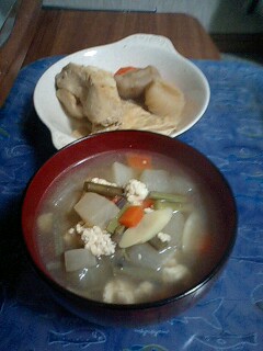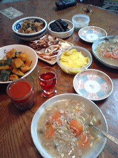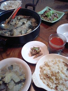 義母の妹さんから美味しい食材を頂きましたので早速好物を作ってお供えしました。あっという間に一年が過ぎてしまいました。しっかり水切りしたお豆腐をぽろぽろに炒めて、大根、人参、竹の子、わらびを入れてお醤油味で整えたけんちん汁。それから厚くて硬い焼き豆腐は丸干し大根、人参と椎茸のお出汁で煮しめました。まだまだ義母の味には及びませんがこれからも機会有るごとに作って行こうと思います。タコははの手帳より「平成18年11月15日 ダイエット22ヶ月15日目夕食メニュー」キムチ鍋、トマトジュース体重58.0