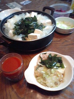 好きです タコはは 好きです タコはは好きです タコはは 好きです タコははいらっしゃいませー ようこそ 「居酒屋 タコはは」 へ 何名様ですか?ハイ 4名様 お席の方へご案内致しまーす。 本日のお品書きのご案内をさせて頂きます。 「湯豆腐」 「トマトジュース」 をご用意致しました。 今晩も在庫処分メニュー第五段をお楽しみ下さい。頂き物の手作り豆腐で湯豆腐にしてみました。冷凍庫からしゃぶしゃぶ用お肉と三陸産ワカメたっぷりに白菜と春雨でボリュームアップしてネギの微塵切りを散らし、あっさりポン酢でお召し上がり下さい。美味しい豆腐にミネラルたっぷりのワカメと春雨のつるつる感が食欲をそそり、もうお腹いっぱい食べてしまいました。今夜はがいいですね。好きです タコはは 好きです タコはは好きです タコはは 好きです タコははあら タコちゃん いらっしゃいませー 今夜も在庫処分メニューですよ。いつまで続くんでしょうね今夜も在庫処分メニューの「北の田舎町の居酒屋さん」メニューでした。タコははの手帳より「平成18年11月17日 ダイエット22ヶ月17日目夕食メニュー」マーボー豆腐、トマトスープ、トマトジュース体重58.0