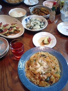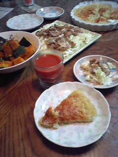 好きです タコはは 好きです タコはは好きです タコはは 好きです タコははいらっしゃいませー ようこそ 「居酒屋 タコはは」 へ 何名様ですか?ハイ 4名様 お席の方へご案内致しまーす。 本日のお品書きのご案内をさせて頂きます。 「スパゲティー」 「ベーコンとキャベツのピンチョス」 「大学かぼちゃ」 「大根おろしとワカメの和えもの」 「トマトジュース」 をご用意致しました。今晩は冷蔵庫に残っていた物のリサイクルメニューでお楽しみ下さい。最初は昨夜のトマトソースに干し小松菜をプラスしてスパゲティーにしてみました。この干し小松菜は暮れに沢山頂いた物を洗って水気を取ってから、お試しで一株づつ間隔を空けて干してみたら以外にも綺麗なフリーズドライになって、低温蒸しで和え物も美味しいので大変重宝しています。それから残っていたかぼちゃのガーリックソテーを一口サイズにカットしてベーコン、レンジ蒸しキャベツといっしょに爪楊枝に刺して食べやすくピンチョスにして、あっさりトマト酢でお召し上がり下さい。そしていとこ煮で残ったかぼちゃの皮をきび砂糖と黒ゴマをふりかけて煎り付けた大学かぼちゃは甘みあっさりに美味しく出来上がりました。今夜はがいいですね。好きです タコはは 好きです タコはは好きです タコはは 好きです タコははあら タコちゃん いらっしゃいませー 今夜はリサイクルメニューですよ。またベーグルじゃないんだ今夜はどうしてもベーグルが気になるタコちゃんが訪れた「北の田舎町の居酒屋さん」メニューでした。タコははの手帳より「平成18年11月25日 ダイエット22ヶ月25日目夕食メニュー」イカゲソ唐揚、ホヤ塩辛、トマトジュース体重58.6