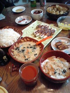 好きです タコはは 好きです タコはは好きです タコはは 好きです タコははいらっしゃいませー ようこそ 「居酒屋 タコはは」 へ 何名様ですか?ハイ 4名様 お席の方へご案内致しまーす。 本日のお品書きのご案内をさせて頂きます。 「サムゲタン風お粥」 「イカ焼き」 「氷頭なます」 「干大根の梅昆布煮」 「かぼちゃの煮物」 「トマトジュース」 をご用意致しました。 今晩は在庫処分メニューの第三段をお楽しみ下さい。今日は七草粥の日でしたので、冷凍庫からお赤飯と年越し蕎麦のお出汁に使ったトリガラのお肉を使い大根、人参、ネギ、茹であずきを煮込んでサムゲタン風お粥にしてみました。トリガラのお肉は蕎麦出汁のいいお味が染み込んでるので綺麗に外してチャーハンや鶏飯等、結構重宝しますから無駄なく使い切りましょう!それから暮れに処理した荒巻鮭の氷頭を塩抜きして薄く切り甘酢に漬けた氷頭なますも柔らかく出来上がりお酒にピッタリの一品になっております。また、同じく暮れに作った輪切り干し大根を梅昆布で煮込んだ梅昆布煮もあっさりしいいお味に出来上がりましたよ。今夜は熱燗にしましょうかね。好きです タコはは 好きです タコはは好きです タコはは 好きです タコははあら タコちゃん いらっしゃいませー 今夜も在庫処分メニューですよ。今年はコレで頑張りまーす今夜も在庫処分メニューの「北の田舎町の居酒屋さん」メニューでした。タコははの手帳より「平成18年11月11日 ダイエット22ヶ月11日目夕食メニュー」残り物(鱈鍋等)、トマトジュース体重57.4