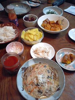 好きです タコはは 好きです タコはは好きです タコはは 好きです タコははいらっしゃいませー ようこそ 「居酒屋 タコはは」 へ 何名様ですか?ハイ 4名様 お席の方へご案内致しまーす。 本日のお品書きのご案内をさせて頂きます。 「モロヘイヤとししゃもっこの和え物」 「山芋千切り」 「とろろそば」 「かぼちゃの煮物」 「トマトジュース」 をご用意致しました。 今晩は在庫処分メニューの第二段ネバネバ系をお楽しみ下さい。冷凍庫のストック食材からモロヘイヤのネバネバとししゃも玉子のつぶつぶが絡んだいい食感のモロヘイヤとししゃもっ子の和え物からお召し上がり下さい。それから少しのお出汁で温めた年越しそばにとろろ汁をたっぷりかけネギの微塵切りを散らしたとろろそばはのどごしつるつる嬉しい一品となっております。そしてレンジでチンの簡単かぼちゃの煮物は甘みあっさり美味しく出来上がりました。今夜は熱燗にしましょうかね。好きです タコはは 好きです タコはは好きです タコはは 好きです タコははあら タコちゃん いらっしゃいませー 今夜は在庫処分のネバネバ系でーす。まだまだ続くんだって今夜は当分在庫処分メニューの「北の田舎町の居酒屋さん」メニューでした。タコははの手帳より「平成18年11月10日 ダイエット22ヶ月10日目夕食メニュー」鱈鍋、トマトジュース体重57.4