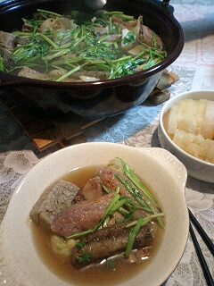 好きです タコはは 好きです タコはは好きです タコはは 好きです タコはは いらっしゃいませー ようこそ 「居酒屋 タコはは」 へ 何名様ですか? ハイ 3名様 お席の方へご案内致しまーす。 本日のお品書きのご案内をさせて頂きます。 「きりたんぽ鍋」 「大根の一本漬け」 「トマトジュース」をご用意致しました。 今夜はきりたんぽ鍋でお楽しみ下さい。 先日作ったごぼう唐揚げの煮汁をベースにして、鶏肉、白菜、セリ、干し豆腐、残っていたごぼう唐揚げと黒米入りの手作りきりたんぽを煮込みました。美味しいごぼうのお出汁が染みますねぇ~♪ 今夜はもっちりきりたんぽでがすすみますよ 好きです タコはは 好きです タコはは好きです タコはは 好きです タコはは