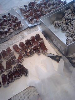 昨日はたっぷり仕上がっている"干し柿"の巻き柿作業をしました。綺麗に粉吹きした干し柿をキッチンバサミで開き、巻きすに並べて巻き巻き~毎年の作業なのに、感を取り戻すまで結構時間がかかるんですよね 取り合えず第一弾は9本出来ました。後は、時間を見て紐で巻いたら、極寒の車庫で更なる粉吹きを期待しましょう