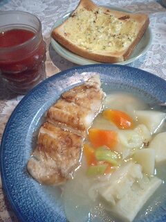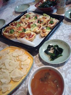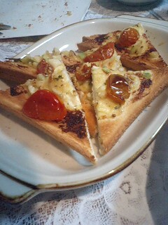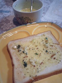 夕食の炭水化物はなるべく控えているですが・・・・・・食パンの在庫処分で、お気に入りの”ガーリックトースト”にしてみました。ニンニクをオリーブオイルでこんがり焼いたら微塵切りにして、マヨネーズ、ドライパセリ、ハーブソルト、塩コショウ、オリーブオイルでペーストにした物を塗り、ドライトマトをのせてこんがり焼きました。ローストニンニクの香ばしい香りでがすすむんですよね~♪こんがり焼く為、翌日の匂いも気にならないので安心ですよ