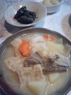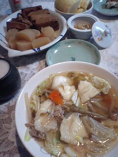 好きです タコはは 好きです タコはは好きです タコはは 好きです タコはは いらっしゃいませー ようこそ 「居酒屋 タコはは」 へ 何名様ですか? ハイ 3名様 お席の方へご案内致しまーす。 本日のお品書きのご案内をさせて頂きます。 「せんべい汁」 「焼き豆腐と大根の煮物」 「大根の一本漬け」 「イカの塩辛」 「トマトジュース」をご用意致しました。 今夜はせんべい汁からお楽しみ下さい。 以前からタコ姉さんにリクエストされていた”おつゆせんべい”をたまたま覗いたスーパーで見つけたので早速作ってみました。白菜、人参、ごぼう、肉、きのこ、つきコン等の材料を醤油仕立ての汁で煮込み、沸騰したら、せんべいを割り入れて、ネギを散らして出来上がりです。 今夜はもっちりせんべい汁でがすすみますよ 好きです タコはは 好きです タコはは好きです タコはは 好きです タコはは