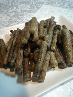 スーパーの産直コーナーで細い土付きごぼうがたっぷり入って超お買い得 早速、金たわしでしごきながら皮をこそげて、三センチぐらいにカットしてアク抜き後、甘辛で少し歯ごたえが残るぐらいに煮付けて置き、翌日に片栗粉を塗して少なめの油でこんがり揚げました。揚げながら一本だけお味見したら・・・・やめられない、止まらない さてさて、ごぼうの旨みたっぷりの煮汁はやっぱりアレがいいかなぁ~