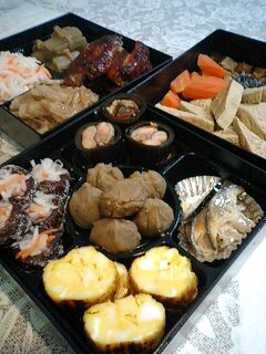 一の重・荒巻鮭のハラスで昆布巻き・荒巻鮭の頭で氷頭なます・ビニール袋で作る、簡単伊達巻・自家製栗きんとん・干し柿なます二の重・紅白なます・蕗と干ぴょうの煮物・氷こんにゃくの炒め物・鶏手羽の照焼き三の重・自家製干し豆腐のお煮しめ仏事の為にちょっと彩り控えめとなりましたが、お重に詰めるとまた気分も変りますね。