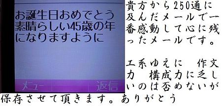 簡単に送れるようになったメール何枚も書き直し 便箋を費やした日々も今は昔軽薄になったもんさぁ面倒ならメール送って済ませればいいやぁ!相手の時間も阻害しないし面倒ならシカトしちゃえばイイんだもん! うま蔵 朝から不覚にも そのメールに涙す 子供の背を追い あわただしい朝に1通のメールが届いていた。 馬鹿な子ほど可愛いのである。 posted by (C)丙谷 うま蔵実は 一昨日の晩メールでやりあった。||。-;)ハナクソみたいな内容で 運良くしてか 悪くしてかそのメールの後に 社長からも「御地通過メール 4県またぎで大変だぁ」と何やらクレームごとで社長自らが出向くとのこと既に年末進行で忙しい身体である。「ありがとうございます。誕生日にメールが来ただけでもうれしいですよ」と返歌した。(社長メールは毎日ではなく 変則で昼夜を問いません。夜中の1時過ぎに飲んで さみしくなるとメールが来る f--;寝てるよ) 社長焦る!(社長は スマートに かっこよくが恋愛のモットーなのである。たぶん) 「朝4時起きで書類書きもあるけど新幹線途中下車します。急ぎでホテルとりますから今夜時間を作って一緒に祝いましょう。」(社長は理文系多動なので エラい長文ですので抜粋)「そう思って頂いただけで 私は十分に幸せですよ私も朝が早いので またお目にかかりましょう」(うま蔵は 文系なので必要外に長いゆえに抜粋 f--;読解力のない工系を苦しめるらしい) うま蔵は 仕事だったので 職場女子の配慮で子供たちからも 「丙谷さん お誕生日おめでとう♪」の言葉をたくさんいただきました。可愛くて あやうくハグしてチューしちゃうとこでした。||。-;)マズいなぁそんで「いくつになったの?」の質問に「25歳」とか20歳もサバよんじゃったし でもね 1日そんな慌ただしいやり取りをして気づいた。返歌 posted by (C)丙谷 うま蔵 もう この歳です。金で買えるもので 物欲は満たしきっているほしいものの大半は持っている。(欲を言えばキリがないし)ほしかったのは 金で買えないもの 誕生日を 忘れずにメールをくれる心忙しい中 時間を割こうとしてくれる想い職場女子の気遣い純粋に祝ってくれる気持ち 今日 誕生日の人の中で たぶん私が一番幸せだと思いますよたぶん四捨五入で50エリアに入りましたがそれに気付かせてくれた人達に感謝です。ありがとうございます。心も体も忙しい日でした。 posted by (C)丙谷 うま蔵 ちなみに 在宅の我が子は 誰も気づいていません。夕食時に ニュースで冷凍食品の日の日付を見て気づく離れた長男からは メールも来ません。 さりげなく「子に美田残さず」が頭に浮かんだ うま蔵でした。 料理一筋18年の私のアラです。 posted by (C)丙谷 うま蔵最近 手抜きが多いです。子供への愛情の薄れか?はたまた子離れか・・・・ 子供が衣づけ役ですぅ posted by (C)丙谷 うま蔵これが 誕生日メニューです。茶色っぽい仕上がりが華やかさを欠きます。 私には辛い味わいで・・・||。-;) posted by (C)丙谷 うま蔵むせるような味わいの婆蔵の料理初公開! 大阪はサラッとしてるけど塩分を多く感じる。 posted by (C)丙谷 うま蔵本場よりも数段味が薄いと思います。 好きなもの食べて何が悪い! posted by (C)丙谷 うま蔵ちなみに1個80円でカットの手間なしローソクはナシでした。||。-;)当たり前だ!