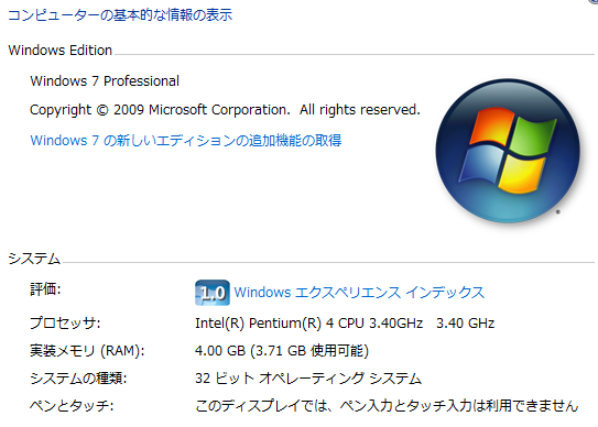 ほぼ10年使っているリビングの自作デスクトップのOSをWindows XPから7にしました。スペックは以下のようにPentium4 3.4GHz、メモリー4GB、32bitというものです。動作が重くなるかと思いましたが、意外とXPと変わらず、これまでのところは軽く動いてくれます。Windows エクスペリエンス インデックスは以下のようになりました。グラフィックが低いのは予想通りでした。これでも、メール、インターネット、オフィスはひととおり使えるので、これでしばらく運用しようと思います。にほんブログ村