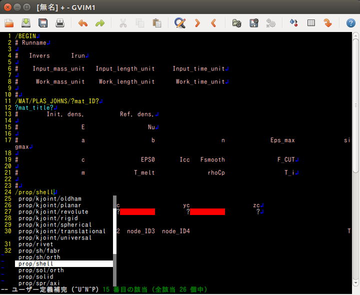 vimのRADIOSS用のプラグイン、vim-radiossを入れてみた。https://github.com/gradzikb/vim-radioss確認できた機能は以下。1. ハイライトと折りたたみでRADIOSSの入力ファイルの可読性が高くなる。2. キーワードをCtr+Tabで書式セットで補完入力してくれる。3.[[, ]]で/からはじまるキーワードにジャンプする。ほかにも、関数のスケールを変えるなどの機能があるようだ。にほんブログ村