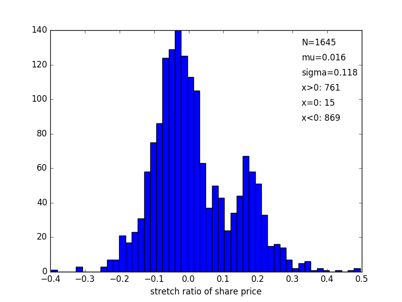 2016/1/4から2016/9/8のストップ高銘柄の翌日の株価伸び率を確認してみた。過去のストップ高銘柄は以下のサイトから得られる。http://aburaya-net.com/stop-h.htm↓結果同じ銘柄が連続でストップ高になっている場合も数えている。株価伸び率が得られたストップ高銘柄の数は1645。株価伸び率の平均値は1.6%。株価伸び率の標準偏差は11.8%翌日の株価が上がる確率=761/1645翌日の株価が変わらない確率=15/1645翌日の株価が下がる確率=869/1645なかなか興味深い。確率としては、下がる確率のほうが大きいが、平均で+1.6%の利益が見込まれる。1年の営業日数240日として、複利で増加すると仮定すると1.016^240=45.13倍!しかし、ひとつ考慮しなくてはならないことがある。それは、証券会社の手数料!仮に手数料が株価の1%もかかるようだと、あっという間に利益がふっとぶ。それでも手数料を差し引いて、仮に1日0.5%の利益になったとしても、1.005^240=3.3倍!試す価値はあるかもしれない。ストップ高の株価を1として4日間のチャートも描いてみた。1日後はヒストグラムと対応する。4日後は、2倍を超える銘柄もある。ストップ高銘柄、注目する価値はあるかもしれない。参考リンクhttp://happy.kabu-web.net/kabu_data_9.html※当エントリーの内容を試されて発生したいかなる損失についても、当方は責任を負いません。自己責任でお願いいたします。にほんブログ村