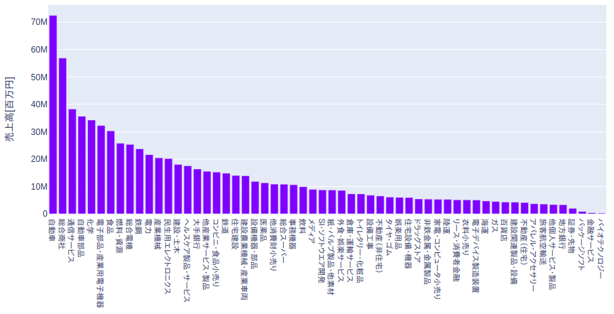 以前、四季報2019年12月発売号から業種ごとの時価総額No.1銘柄を確認しました。https://plaza.rakuten.co.jp/takupin/diary/201912290000/今回は、業種ごとの売上高と会社数ランキングを確認しました。いわゆる東証33業種ではなく、より実際の事業内容に近い業種が四季報には書かれています。その数60。自動車業界は8社しかないのに売上高がダントツでトップの72兆円です。やはり、トヨタ、ホンダ、日産があるからですね。↓売上高ランキング↓会社数ランキングにほんブログ村