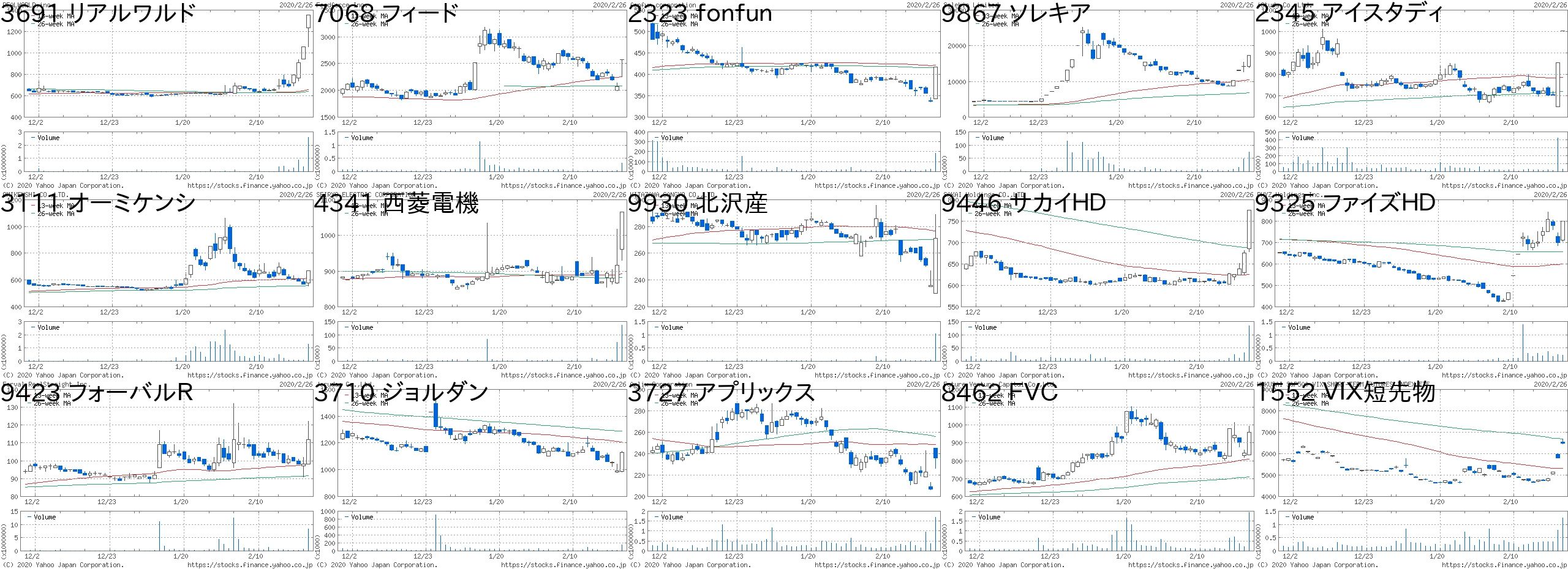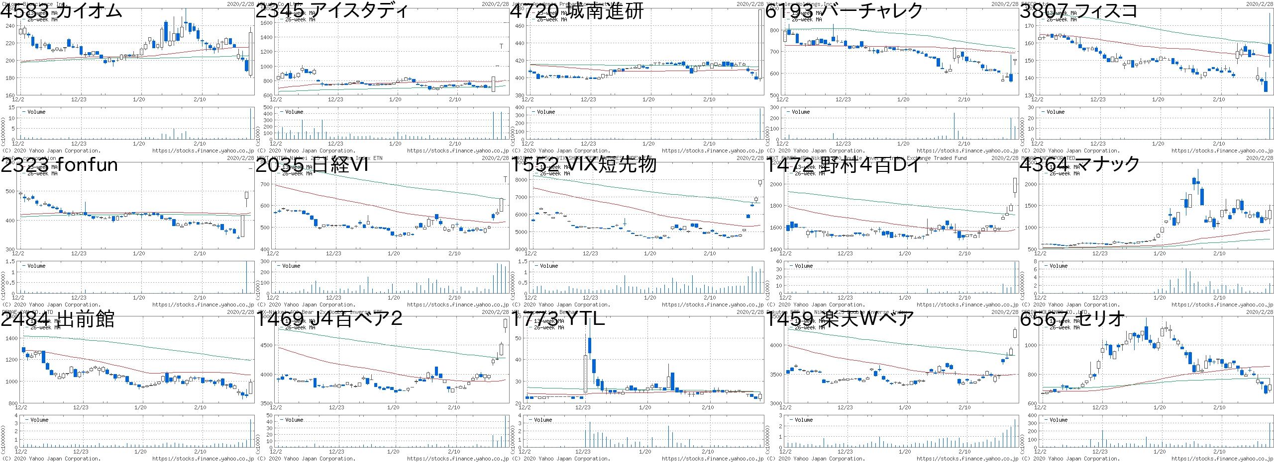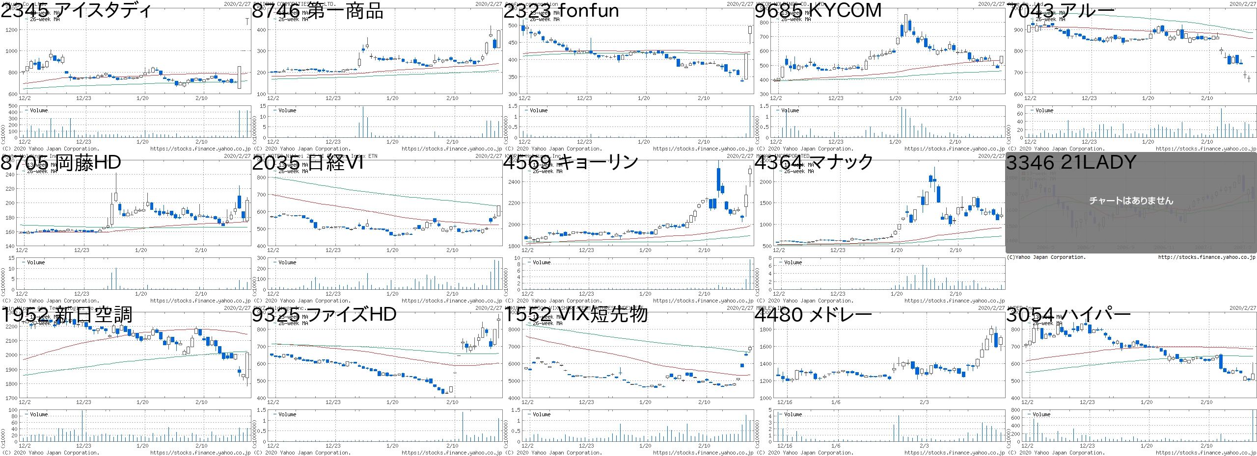 コード 銘柄名 市場 株価 前日比 前日比.1 出来高 PER PBR 利回り2345 アイスタディ 東2 1304 300 +29.88% 423200 60.3 3.85 -8746 第一商品 JQ 395 80 +25.40% 7599000 - 1.05 -2323 fonfun JQ 497 80 +19.18% 1481300 165 3.14 -9685 KYCOM JQ 563 80 +16.56% 107900 15.9 1.17 -7043 アルー 東M 774 100 +14.84% 8900 19.5 1.85 0.98705 岡藤HD JQ 204 25 +13.97% 3413200 - 0.67 -2035 日経VI 東EN 634 65 +11.42% 268089 - - -4569 キョーリン 東1 2517 243 +10.69% 9385600 26.7 1.17 2.984364 マナック 東2 1222 117 +10.59% 1062000 26.7 1.05 0.613346 21LADY 名C 215 17 +8.59% 71400 - 16.04 -1952 新日空調 東1 2016 151 +8.10% 41300 12.6 1.07 2.739325 ファイズHD 東1 859 60 +7.51% 1081300 62.2 7.49 -1552 VIX短先物 東E 6950 460 +7.09% 981850 - - -4480 メドレー 東M 1705 110 +6.90% 1420300 112 14.35 -3054 ハイパー 東2 540 33 +6.51% 790700 14.7 1.64 1.67コード 銘柄名 市場 株価 前日比 前日比.1 出来高 PER PBR 利回り2157 コシダカHD 東1 601 -825 -57.85% 2356800 8.9 1.53 23691 リアルワルド 東M 1056 -300 -22.12% 1876400 - 2.82 -9969 ショクブン 東2 272 -59 -17.82% 3935000 12.5 - -7083 AHC 東M 2634 -531 -16.78% 325300 26.3 20.17 -6769 ザイン JQ 1043 -195 -15.75% 664100 489 1.26 0.868462 FVC JQ 811 -150 -15.61% 1079700 - 2.77 -6786 RVH 東2 130 -24 -15.58% 1031100 - 0.39 -6656 インスペック 東2 4030 -700 -14.80% 731200 63.1 11.98 0.073177 ありがとうS JQ 2063 -353 -14.61% 7900 7.4 0.98 4.363557 U&C 東M 1371 -233 -14.53% 16100 33.8 2.47 -2300 きょくとう JQ 505 -85 -14.41% 45300 12.2 0.7 2.183057 ゼットン 名C 850 -141 -14.23% 32200 11.5 3.44 0.594337 ぴあ 東1 3035 -495 -14.02% 106900 50.4 6.7 0.662747 北雄ラッキー JQ 2842 -448 -13.62% 13000 15 0.74 1.766734 ニューテック JQ 2310 -362 -13.55% 181900 26 2.89 1.08にほんブログ村