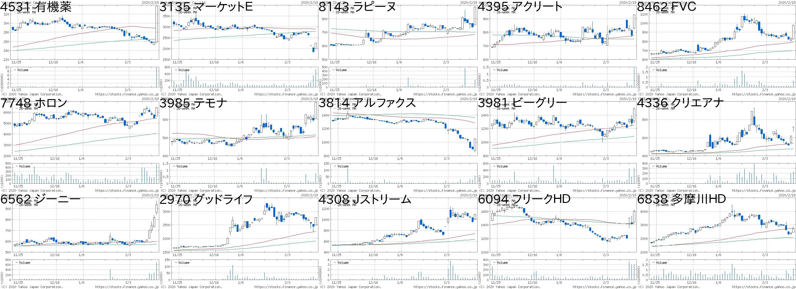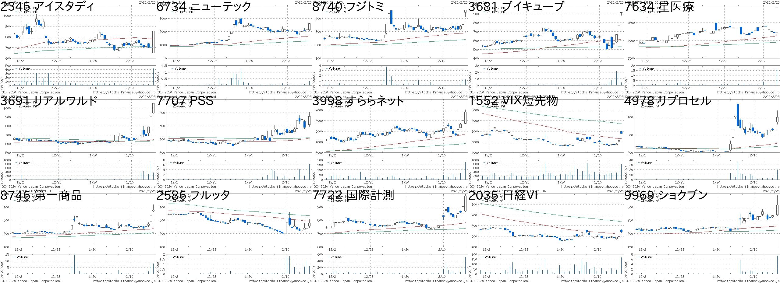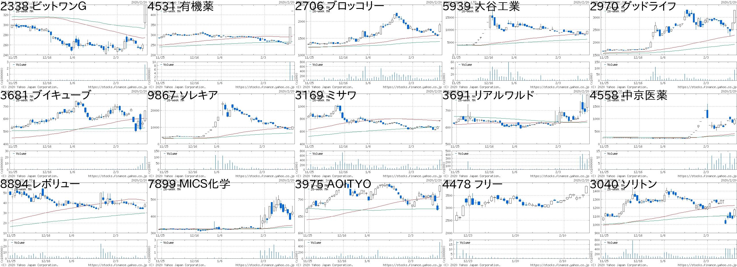 コード 銘柄名 市場 株価 前日比 前日比.1 出来高 PER PBR 利回り2345 アイスタディ 東2 1304 300 +29.88% 423200 60.3 3.85 -8746 第一商品 JQ 395 80 +25.40% 7599000 - 1.05 -2323 fonfun JQ 497 80 +19.18% 1481300 165 3.14 -9685 KYCOM JQ 563 80 +16.56% 107900 15.9 1.17 -7043 アルー 東M 774 100 +14.84% 8900 19.5 1.85 0.98705 岡藤HD JQ 204 25 +13.97% 3413200 - 0.67 -2035 日経VI 東EN 634 65 +11.42% 268089 - - -4569 キョーリン 東1 2517 243 +10.69% 9385600 26.7 1.17 2.984364 マナック 東2 1222 117 +10.59% 1062000 26.7 1.05 0.613346 21LADY 名C 215 17 +8.59% 71400 - 16.04 -1952 新日空調 東1 2016 151 +8.10% 41300 12.6 1.07 2.739325 ファイズHD 東1 859 60 +7.51% 1081300 62.2 7.49 -1552 VIX短先物 東E 6950 460 +7.09% 981850 - - -4480 メドレー 東M 1705 110 +6.90% 1420300 112 14.35 -3054 ハイパー 東2 540 33 +6.51% 790700 14.7 1.64 1.67コード 銘柄名 市場 株価 前日比 前日比.1 出来高 PER PBR 利回り2157 コシダカHD 東1 601 -825 -57.85% 2356800 8.9 1.53 23691 リアルワルド 東M 1056 -300 -22.12% 1876400 - 2.82 -9969 ショクブン 東2 272 -59 -17.82% 3935000 12.5 - -7083 AHC 東M 2634 -531 -16.78% 325300 26.3 20.17 -6769 ザイン JQ 1043 -195 -15.75% 664100 489 1.26 0.868462 FVC JQ 811 -150 -15.61% 1079700 - 2.77 -6786 RVH 東2 130 -24 -15.58% 1031100 - 0.39 -6656 インスペック 東2 4030 -700 -14.80% 731200 63.1 11.98 0.073177 ありがとうS JQ 2063 -353 -14.61% 7900 7.4 0.98 4.363557 U&C 東M 1371 -233 -14.53% 16100 33.8 2.47 -2300 きょくとう JQ 505 -85 -14.41% 45300 12.2 0.7 2.183057 ゼットン 名C 850 -141 -14.23% 32200 11.5 3.44 0.594337 ぴあ 東1 3035 -495 -14.02% 106900 50.4 6.7 0.662747 北雄ラッキー JQ 2842 -448 -13.62% 13000 15 0.74 1.766734 ニューテック JQ 2310 -362 -13.55% 181900 26 2.89 1.08にほんブログ村