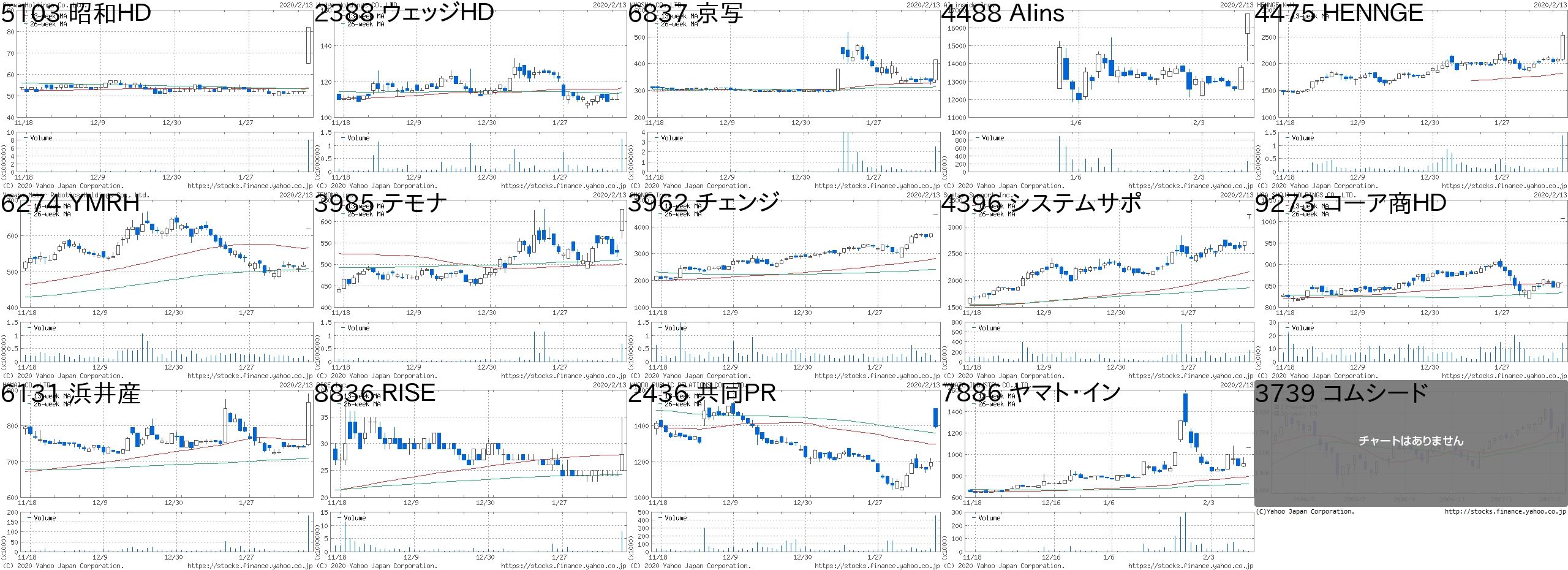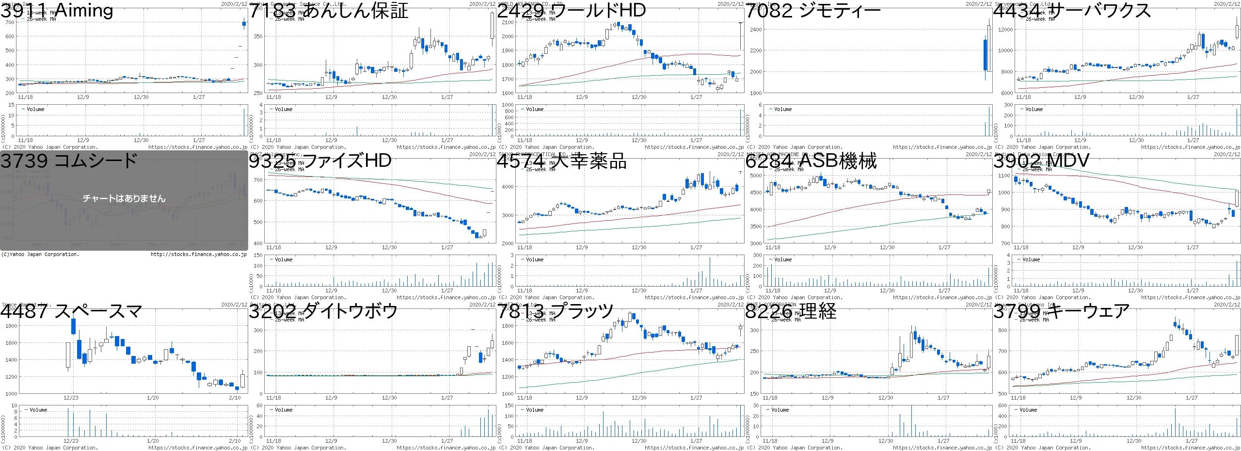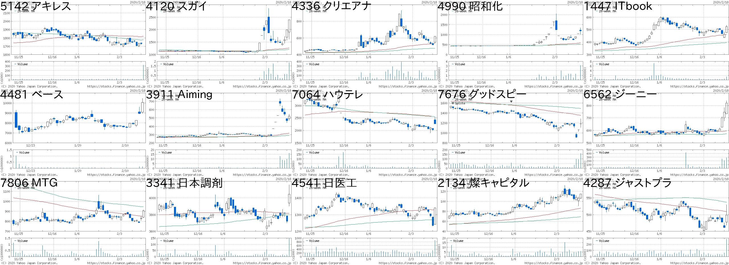 コード 銘柄名 市場 株価 前日比 前日比.1 出来高 PER PBR 利回り5142 アキレス 東1 2130 400 +23.12% 321900 17.6 0.81 1.884120 スガイ 東2 2390 400 +20.10% 1890500 23.4 0.57 1.264336 クリエアナ JQ 618 100 +19.31% 202600 17.4 1.3 1.294990 昭和化 東2 1188 143 +13.68% 3129800 29.2 2.31 0.421447 ITbook 東M 525 63 +13.64% 1378000 54.7 5.07 -4481 ベース 東2 10050 1100 +12.29% 145100 21.4 5.39 1.393911 Aiming 東M 522 55 +11.78% 16395100 - 16.71 -7064 ハウテレ 東M 2260 233 +11.49% 103000 71.6 6.01 -7676 グッドスピー 東M 1185 120 +11.27% 160100 17.1 2.63 0.596562 ジーニー 東M 820 73 +9.77% 284500 - 5.87 -7806 MTG 東M 905 75 +9.04% 451700 - 1.13 -3341 日本調剤 東1 4045 325 +8.74% 147700 10.1 1.4 1.244541 日医工 東1 1340 105 +8.50% 874400 14.3 0.72 2.242134 燦キャピタル JQ 115 9 +8.49% 5841600 - 5.17 -4287 ジャストプラ JQ 499 38 +8.24% 280400 55.8 2.01 1.48コード 銘柄名 市場 株価 前日比 前日比.1 出来高 PER PBR 利回り2334 イオレ 東M 1598 -500 -23.83% 9700 923 3.22 -4563 アンジェス 東M 462 -100 -17.79% 517300 - 4.13 -7681 レオクラン 東2 2058 -397 -16.17% 106000 65.6 0.87 2.194364 マナック 東2 1400 -235 -14.37% 1494000 30.6 1.21 0.543689 イグニス 東M 1234 -206 -14.31% 1022300 - 8.28 -3528 プロスペクト 東2 26 -4 -13.33% 10070800 - 0.75 3.859272 ブティックス 東M 2476 -369 -12.97% 10200 41.2 10.19 -3417 大木ヘルス JQ 1346 -200 -12.94% 339200 - 0.98 -3386 コスモバイオ JQ 1200 -170 -12.41% 629500 22.9 1.04 1.53135 マーケットE 東M 1863 -262 -12.33% 354000 36 7.38 -3799 キーウェア 東2 722 -100 -12.17% 614600 18 0.96 1.668893 新日建物 JQ 444 -57 -11.38% 875500 6.7 1.6 4.53161 アゼアス 東2 1397 -179 -11.36% 1681000 36.1 1.45 0.866071 IBJ 東1 1172 -147 -11.14% 1048000 27.4 9.51 -3125 内外綿 東2 1198 -147 -10.93% 698700 783 0.86 1.67にほんブログ村