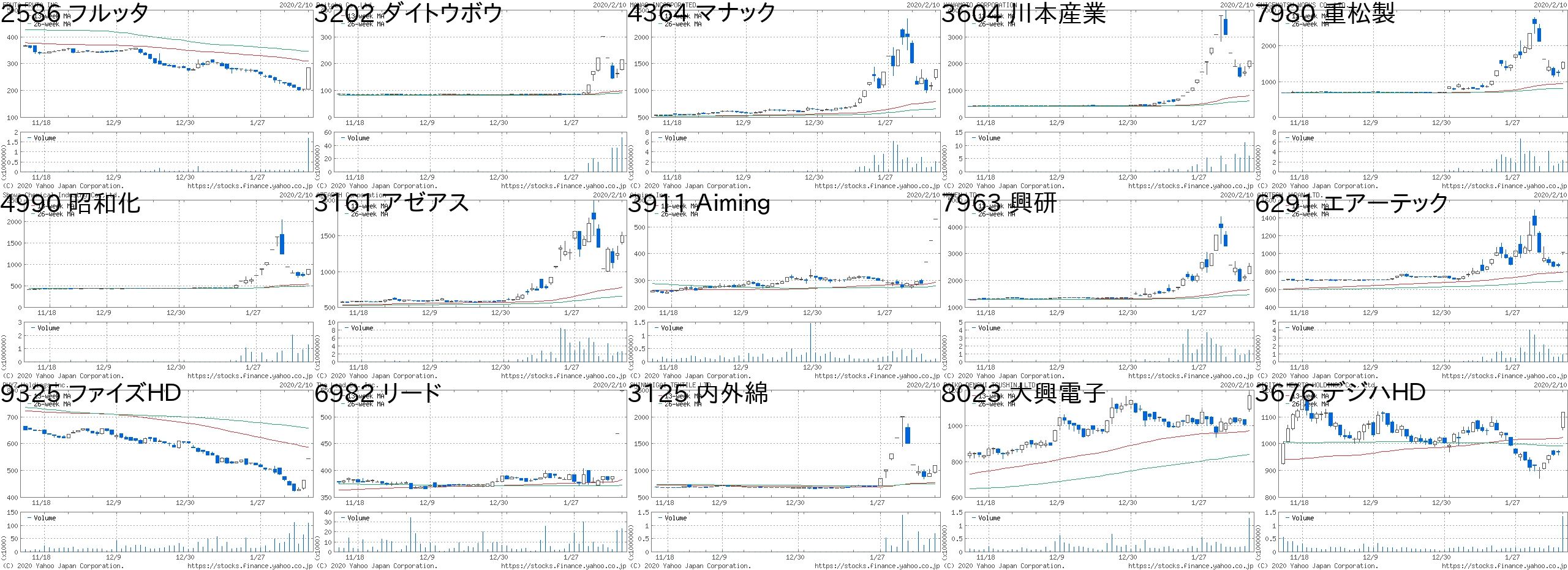 コード 銘柄名 市場 株価 前日比 前日比.1 出来高 PER PBR 利回り2586 フルッタ 東M 285 80 +39.02% 1705500 - - -3202 ダイトウボウ 東1 215 50 +30.30% 51315100 28 1.42 -4364 マナック 東2 1392 300 +27.47% 2054600 30.4 1.2 0.543604 川本産業 東2 2100 400 +23.53% 6078900 50.7 3.4 0.297980 重松製 JQ 1535 280 +22.31% 2363900 78 2.35 0.654990 昭和化 東2 889 150 +20.30% 1272700 21.9 1.8 0.563161 アゼアス 東2 1506 248 +19.71% 2627400 38.9 1.56 0.83911 Aiming 東M 530 80 +17.78% 105300 - 12.17 -7963 興研 JQ 2531 381 +17.72% 1470200 34.2 1.31 0.996291 エアーテック 東1 1019 150 +17.26% 895400 25.1 0.91 2.169325 ファイズHD 東1 545 80 +17.20% 108300 39.5 4.75 -6982 リード 東2 549 80 +17.06% 23100 12.8 0.49 1.823125 内外綿 東2 1090 150 +15.96% 686300 712 0.79 1.838023 大興電子 東2 1169 160 +15.86% 1266400 14.8 2.01 0.513676 デジハHD 東1 1118 150 +15.50% 1339600 19.3 4.87 1.25コード 銘柄名 市場 株価 前日比 前日比.1 出来高 PER PBR 利回り3830 ギガプライズ 名C 1730 -500 -22.42% 10100 29.7 10.39 0.23625 テックファム JG 1204 -259 -17.70% 535700 19.7 2.46 0.425981 東京綱 東1 969 -168 -14.78% 310100 78 0.67 -4734 ビーイング JQ 979 -167 -14.57% 202200 14 2.03 2.666822 大井電気 JQ 3115 -475 -13.23% 33100 12.2 0.65 1.614442 バルテス 東M 1771 -239 -11.89% 284500 63.1 10.8 -6245 ヒラノテク 東2 1517 -189 -11.08% 111200 8.5 0.78 2.373997 Tワークス JQ 1043 -128 -10.93% 43500 34.5 2.35 0.483929 Sワイヤー 東M 1371 -151 -9.92% 145300 50.9 6.41 0.883660 アイスタイル 東1 406 -44 -9.78% 2636300 - 4.08 -6834 精工技研 JQ 2721 -294 -9.75% 192800 19.8 1.07 1.477578 ニチリョク JQ 1121 -118 -9.52% 26100 7.2 0.41 2.684388 エーアイ 東M 1812 -190 -9.49% 247500 56.7 9.18 0.336548 旅工房 東M 1683 -176 -9.47% 186800 37 4.56 -4080 田中化研 JQ 758 -79 -9.44% 319700 - 1.79 -にほんブログ村
