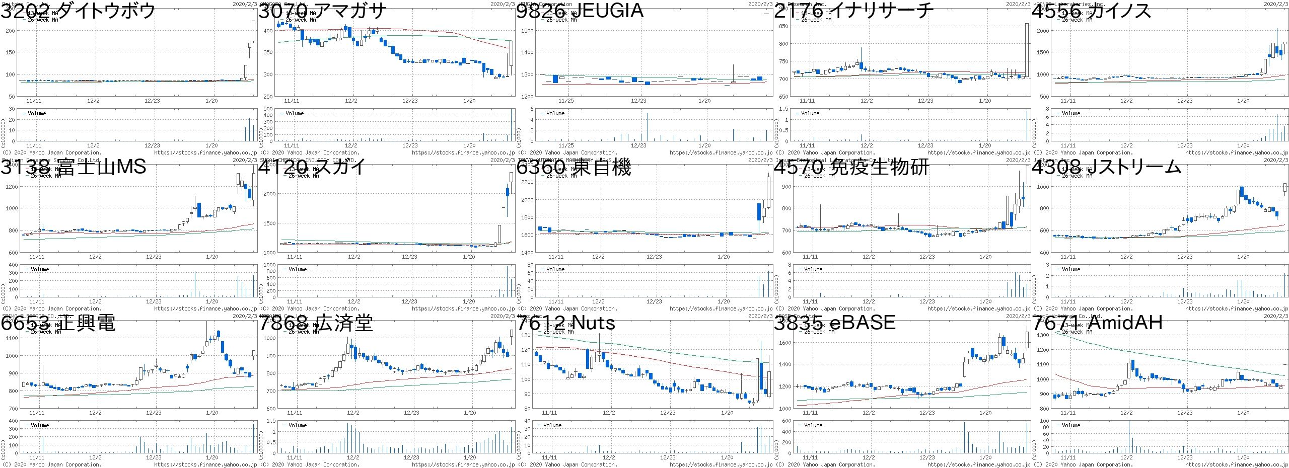 コード 銘柄名 市場 株価 前日比 前日比.1 出来高 PER PBR 利回り3202 ダイトウボウ 東1 301 80 +36.20% 1168600 39.1 2.02 -7671 AmidAH 東M 1399 300 +27.30% 134700 19.4 1.91 -6635 大日光 JQ 1479 300 +25.45% 653400 17.7 1.59 1.356050 イーガーディ 東1 2202 400 +22.20% 899800 26.2 6.24 -3070 アマガサ JG 456 80 +21.28% 385600 - 1.38 -2929 ファーマF 東2 989 150 +17.88% 4292500 59.5 8.13 -2176 イナリサーチ JQ 1007 150 +17.50% 2299400 47.9 4.3 -6941 山一電機 東1 1910 284 +17.47% 1524400 15.1 1.8 1.992551 マルサンアイ 名2 4300 615 +16.69% 12400 16 1.64 0.79709 NCS&A 東2 760 100 +15.15% 569300 10.9 1.5 3.164746 東計電算 東1 4025 495 +14.02% 97700 13 1.41 2.736190 フェニクスB 東M 907 102 +12.67% 543900 - 1.9 -6924 岩崎電 東1 1703 180 +11.82% 770900 8.2 0.46 2.353941 レンゴー 東1 857 90 +11.73% 6455000 7.6 0.78 2.333612 ワールド 東1 2596 272 +11.70% 431600 7.1 1.01 2.77コード 銘柄名 市場 株価 前日比 前日比.1 出来高 PER PBR 利回り4558 中京医薬 JQ 742 -300 -28.79% 97000 138 3.64 0.673125 内外綿 東2 1109 -400 -26.51% 16800 724 0.8 1.84364 マナック 東2 1114 -400 -26.42% 1575300 26.5 0.98 0.674990 昭和化 東2 943 -300 -24.14% 42800 23.2 1.91 0.537980 重松製 JQ 1630 -500 -23.47% 35300 82.8 2.51 0.613604 川本産業 東2 2395 -700 -22.62% 58700 57.8 3.81 0.254556 カイノス JQ 1342 -391 -22.56% 2355300 12.5 1.28 1.123161 アゼアス 東2 1038 -300 -22.42% 417200 26.8 1.08 1.167963 興研 JQ 2580 -700 -21.34% 18500 46.1 1.34 0.974120 スガイ 東2 1863 -500 -21.16% 1260300 18.2 0.46 1.619768 いであ 東1 2301 -500 -17.85% 242900 11.2 0.95 1.36619 WSCOPE 東1 735 -150 -16.95% 4679000 - 2.16 -4570 免疫生物研 JG 850 -143 -14.40% 11339400 - 3.93 -4800 オリコン JQ 1316 -204 -13.42% 972700 24.9 6.67 1.294247 ポバール興業 名2 2200 -340 -13.39% 1100 8.8 0.6 2.27にほんブログ村