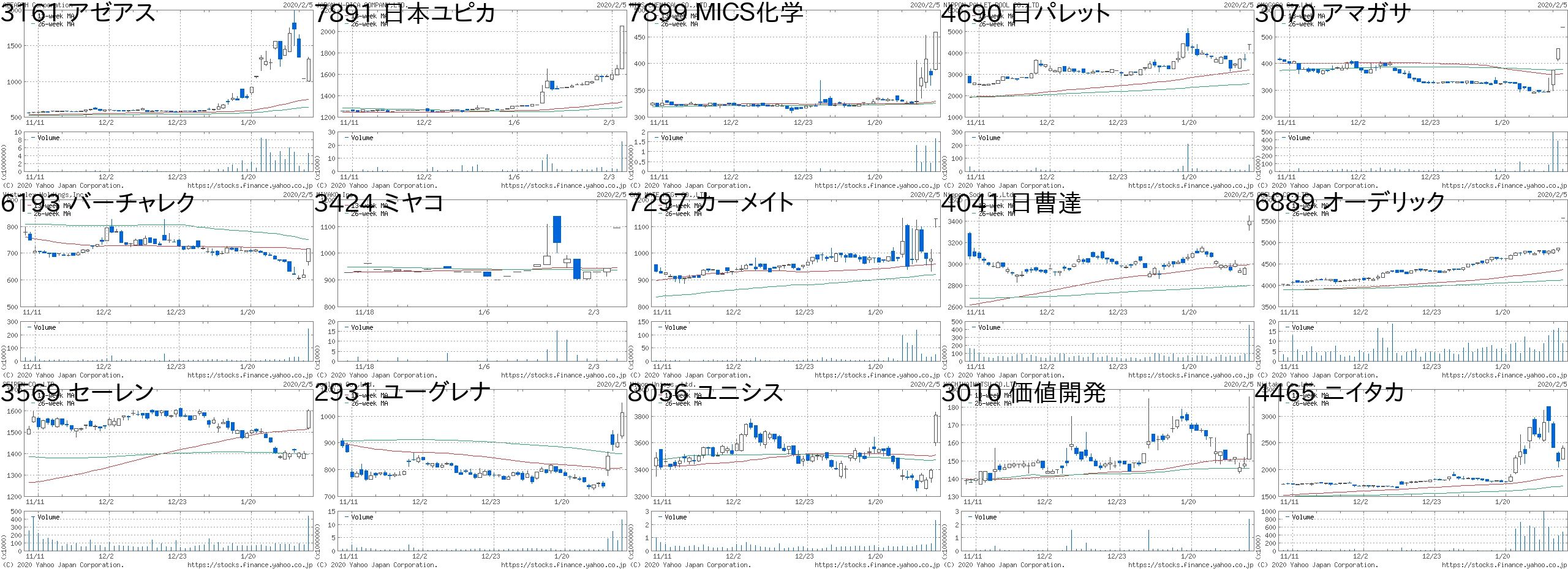コード 銘柄名 市場 株価 前日比 前日比.1 出来高 PER PBR 利回り3161 アゼアス 東2 1310 272 +26.20% 4623200 33.8 1.36 0.927891 日本ユピカ JQ 2051 400 +24.23% 22400 24.5 0.63 -7899 MICS化学 JQ 459 80 +21.11% 1653400 42.3 0.76 2.184690 日パレット JQ 4405 700 +18.89% 50400 9.8 0.88 1.593070 アマガサ JG 536 80 +17.54% 28700 - 1.62 -6193 バーチャレク 東M 718 100 +16.18% 246900 - 4.18 -3424 ミヤコ JQ 1095 150 +15.87% 1200 10.9 0.78 0.917297 カーメイト JQ 1129 150 +15.32% 26000 11.8 0.63 1.954041 日曹達 東1 3400 438 +14.79% 453800 17.7 0.72 2.356889 オーデリック JQ 5570 700 +14.37% 9000 10 0.98 1.263569 セーレン 東1 1600 199 +14.20% 436600 11.4 1.17 2.252931 ユーグレナ 東1 1012 111 +12.32% 11797900 - 8.69 -8056 ユニシス 東1 3810 415 +12.22% 2293500 21.8 3.19 1.843010 価値開発 東2 165 17 +11.49% 2415700 85.9 8.94 -4465 ニイタカ 東1 2408 247 +11.43% 475300 16.7 1.41 1.08コード 銘柄名 市場 株価 前日比 前日比.1 出来高 PER PBR 利回り3202 ダイトウボウ 東1 221 -80 -26.58% 1278800 28.7 1.49 -2176 イナリサーチ JQ 780 -227 -22.54% 1059900 37.1 3.33 -3604 川本産業 東2 1895 -500 -20.88% 6662100 45.8 3.02 0.323910 MKシステム JQ 1555 -400 -20.46% 978300 37.5 7.03 0.514120 スガイ 東2 1545 -318 -17.07% 647800 15.1 0.37 1.944990 昭和化 東2 798 -145 -15.38% 2042000 19.7 1.62 0.637980 重松製 JQ 1400 -230 -14.11% 4146400 71.1 2.15 0.713125 内外綿 東2 980 -129 -11.63% 757000 640 0.71 2.048699 沢田HD JQ 1000 -118 -10.55% 212200 - 0.68 -4644 イマジニア JQ 1389 -143 -9.33% 1267600 26.3 1.36 2.166190 フェニクスB 東M 823 -84 -9.26% 75600 - 1.73 -2317 システナ 東1 1741 -165 -8.66% 2363300 32.8 8.06 1.157671 AmidAH 東M 1283 -116 -8.29% 178500 17.8 1.75 -6408 クラッチ JQ 4325 -390 -8.27% 10500 10.6 0.38 -5903 SHINPO JQ 1949 -169 -7.98% 122200 18.2 2.33 1.28にほんブログ村