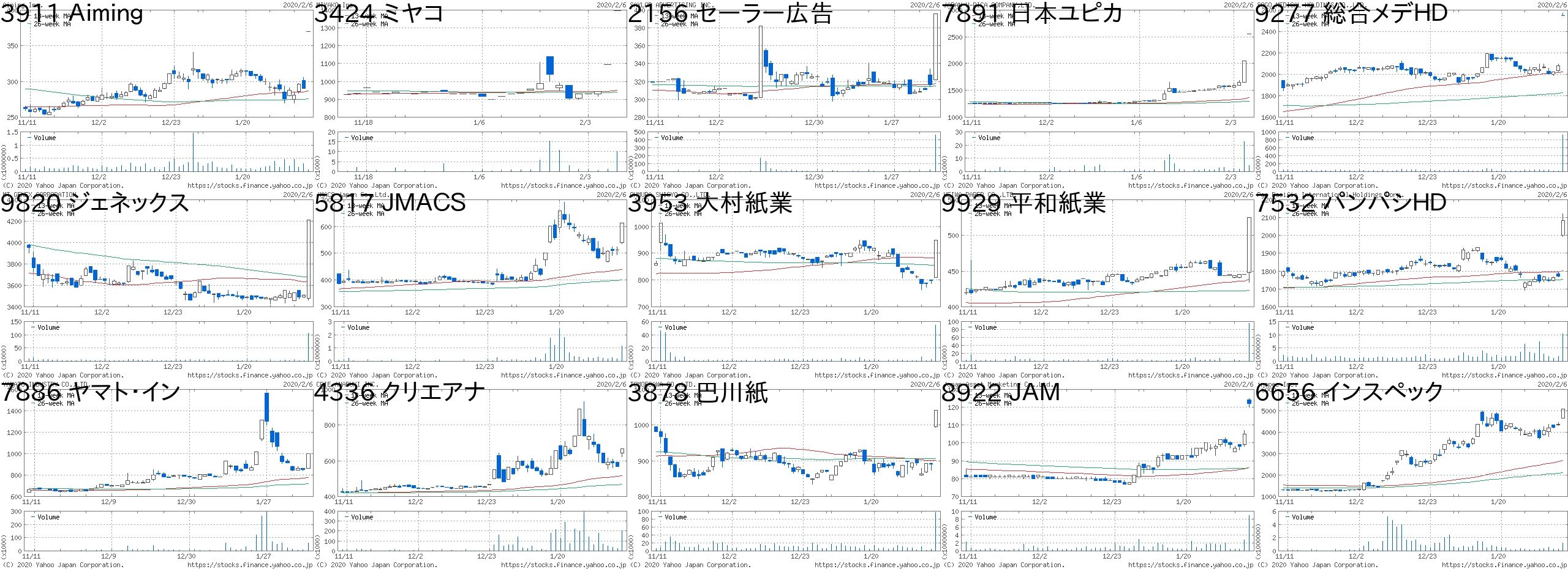 コード 銘柄名 市場 株価 前日比 前日比.1 出来高 PER PBR 利回り3911 Aiming 東M 370 80 +27.59% 74100 - 8.5 -3424 ミヤコ JQ 1395 300 +27.40% 10000 13.9 0.99 0.722156 セーラー広告 JQ 396 80 +25.32% 461500 - 0.83 1.267891 日本ユピカ JQ 2551 500 +24.38% 4500 30.5 0.78 -9277 総合メデHD 東1 2546 466 +22.40% 920600 20.8 1.92 0.549820 ジェネックス JQ 4210 700 +19.94% 105300 11.9 1.57 0.955817 JMACS 東2 612 100 +19.53% 1166400 40.4 0.64 1.633953 大村紙業 JQ 948 150 +18.80% 54600 33.3 0.86 1.059929 平和紙業 東2 525 80 +17.98% 96000 21.3 0.59 1.97532 パンパシHD 東1 2084 314 +17.74% 10348100 28.7 3.76 0.557886 ヤマト・イン JQ 1000 150 +17.65% 59900 - 0.57 -4336 クリエアナ JQ 669 100 +17.57% 204900 18.9 1.45 1.23878 巴川紙 東1 1041 150 +16.84% 96200 - 1.15 2.48922 JAM 東M 122 17 +16.19% 8898400 13.9 0.82 -6656 インスペック 東2 5080 700 +15.98% 1232600 79.4 15.07 0.06コード 銘柄名 市場 株価 前日比 前日比.1 出来高 PER PBR 利回り3202 ダイトウボウ 東1 147 -74 -33.48% 35925500 19.1 0.97 -3739 コムシード 名C 838 -300 -26.36% 444100 481 6.92 -7404 昭和飛 東2 2124 -621 -22.62% 1134600 46.2 2 29.947963 興研 JQ 1991 -467 -19.00% 822600 35.6 1.03 1.263070 アマガサ JG 436 -100 -18.66% 1070800 - 1.32 -3604 川本産業 東2 1542 -353 -18.63% 5290900 37.2 2.46 0.396195 ホープ 東M 2290 -500 -17.92% 1144900 - 24.14 0.664364 マナック 東2 1010 -216 -17.62% 848000 24 0.89 0.744558 中京医薬 JQ 619 -127 -17.02% 4194600 115 2.79 0.813668 コロプラ 東1 998 -190 -15.99% 11278400 - 1.81 -2425 ケアサービス JG 626 -114 -15.41% 73700 9.1 1.42 1.122130 メンバーズ 東1 1621 -292 -15.26% 797300 26 5.67 0.867980 重松製 JQ 1191 -209 -14.93% 1292300 60.5 1.82 0.844356 応用技術 JQ 3205 -550 -14.65% 392600 20.9 3.64 -3161 アゼアス 東2 1127 -183 -13.97% 1589000 29.1 1.17 1.06にほんブログ村
