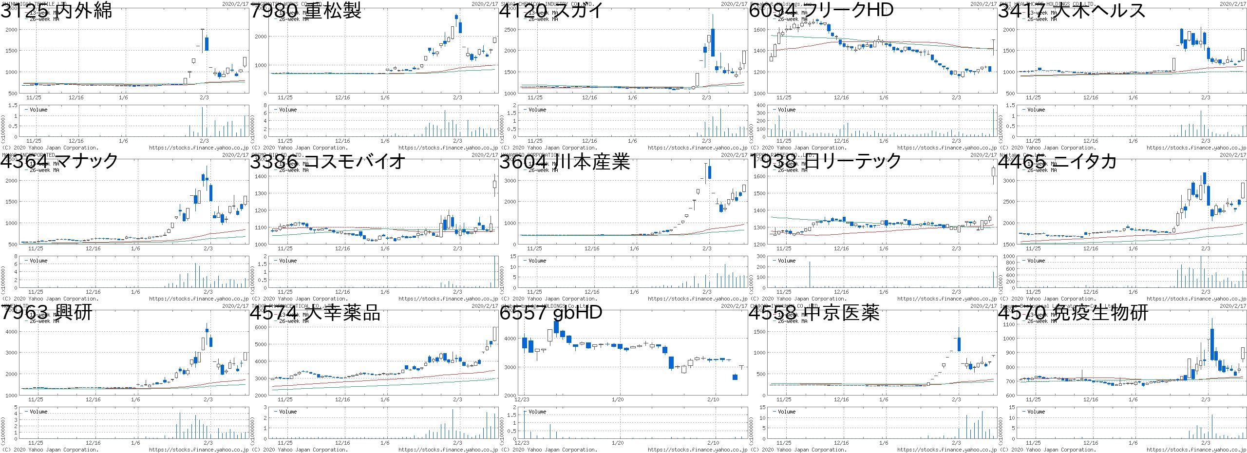 コード 銘柄名 市場 株価 前日比 前日比.1 出来高 PER PBR 利回り4531 有機薬 東1 338 80 +31.01% 9922800 82 0.68 0.893135 マーケットE 東M 2263 400 +21.47% 529800 43.8 8.96 -8143 ラピーヌ 東2 887 146 +19.70% 175500 - 0.51 1.694395 アクリート 東M 929 150 +19.26% 1452800 25 5.02 1.088462 FVC JQ 980 150 +18.07% 656100 - 3.35 -7748 ホロン JQ 6430 950 +17.34% 467800 28.5 8.31 0.313985 テモナ 東1 697 100 +16.75% 733900 70.4 5.03 -3814 アルファクス JG 1050 150 +16.67% 57600 17.4 1.89 0.953981 ビーグリー 東1 1492 211 +16.47% 452200 15 1.86 -4336 クリエアナ JQ 718 100 +16.18% 235500 20.2 1.51 1.116562 ジーニー 東M 937 117 +14.27% 693200 - 6.71 -2970 グッドライフ JQ 2780 336 +13.75% 7000 10.4 2.01 -4308 Jストリーム 東M 1091 130 +13.53% 607600 60.4 3.28 -6094 フリークHD 東M 1605 187 +13.19% 301100 - 5.29 -6838 多摩川HD JQ 2741 319 +13.17% 1069100 39 3.41 0.18コード 銘柄名 市場 株価 前日比 前日比.1 出来高 PER PBR 利回り3604 川本産業 東2 2389 -383 -13.82% 2971900 57.7 3.87 0.254558 中京医薬 JQ 862 -136 -13.63% 3873100 161 3.89 0.587963 興研 JQ 2529 -319 -11.20% 437200 32.5 1.29 0.997980 重松製 JQ 1656 -204 -10.97% 1787700 84.1 2.53 0.63125 内外綿 東2 1067 -131 -10.93% 174300 697 0.77 1.871447 ITbook 東M 472 -53 -10.10% 950900 49.2 4.56 -5142 アキレス 東1 1915 -215 -10.09% 1202600 15.9 0.73 2.094574 大幸薬品 東1 5150 -530 -9.33% 1290400 39.4 3.91 0.783202 ダイトウボウ 東1 228 -23 -9.16% 12667200 29.6 1.51 -4990 昭和化 東2 1080 -108 -9.09% 1164500 26.5 2.1 0.468918 ランド 東1 10 -1 -9.09% 8160200 - 1.93 -7899 MICS化学 JQ 381 -37 -8.85% 316700 35.1 0.63 2.623996 サインポスト 東1 2030 -184 -8.31% 113800 - 18.85 0.122134 燦キャピタル JQ 107 -8 -6.96% 9590000 - 4.81 -6316 丸山製 東1 1608 -120 -6.94% 368400 19.2 0.51 2.18にほんブログ村